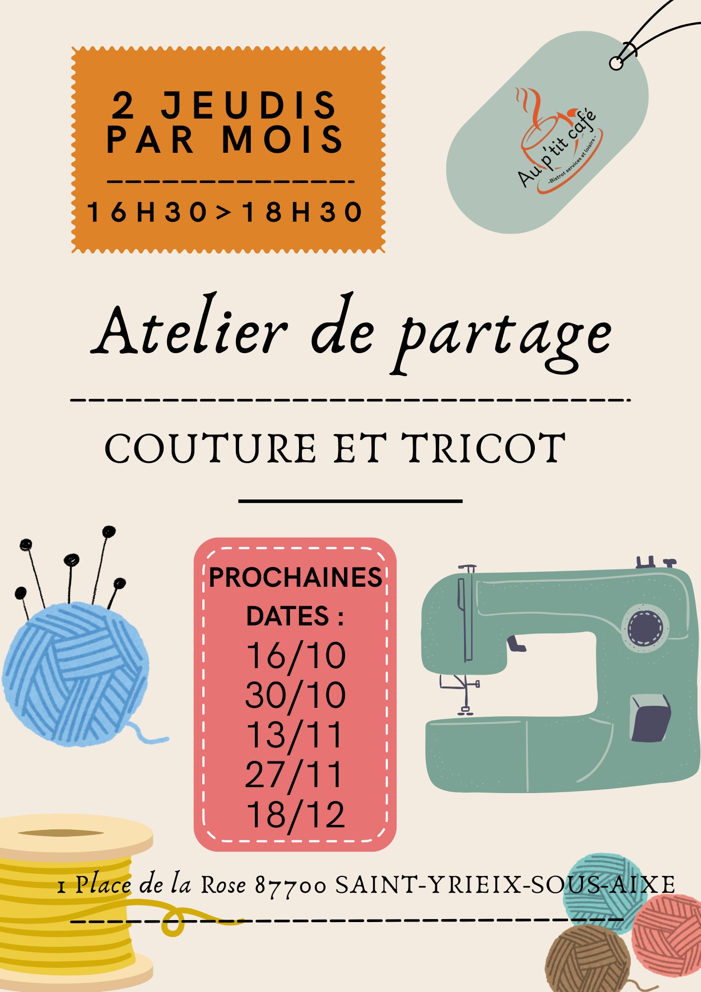 - deux jeudis par mois de 16h30 à 18h30: atelier partage couture et tricot.