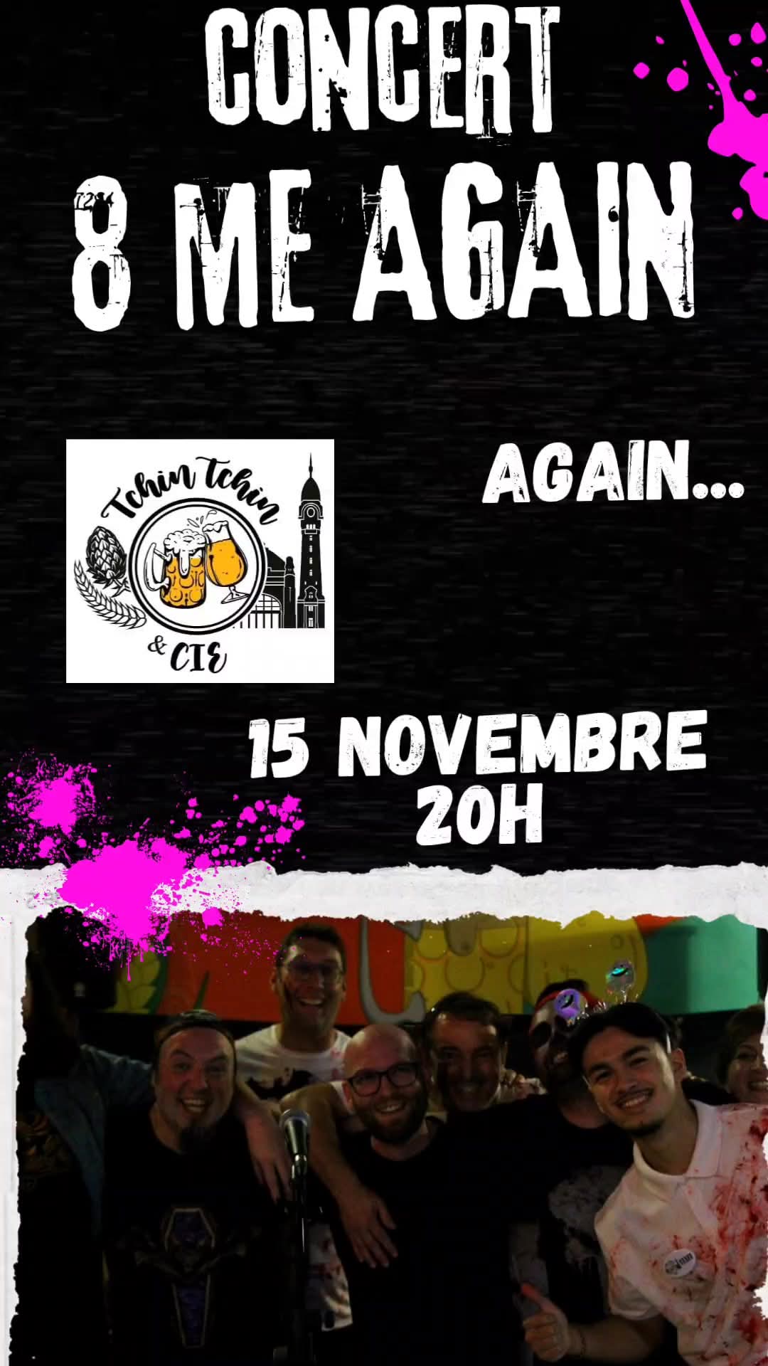 Retrouvez le groupe 8 Me Again à Tchin Tchin et Cie. ce groupe de rock alternatif diffuse sa musique inspirée de Brit Rock (Oasis) et de Rock US (Green Day, Sum 41, Blink 182...). En première partie vous pourrez écouter Astrid la Troubadour qui vous fera taper du pied sur des morceaux connus et sur ses compositions électro acoustiques.