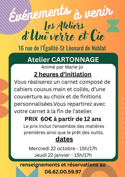 Atelier de cartonnage animé par Marie-Jo. Vous réaliserez un carnet composé de cahiers cousus main et collés, d'une couverture au choix et de finitions personnalisées. Vous repartirez avec votre carnet à la fin de l'atelier. Le prix inclut l'ensemble des matières premières ainsi que le prêt des outils. Réservation obligatoire. Enfants à partir de 12 ans et adultes.