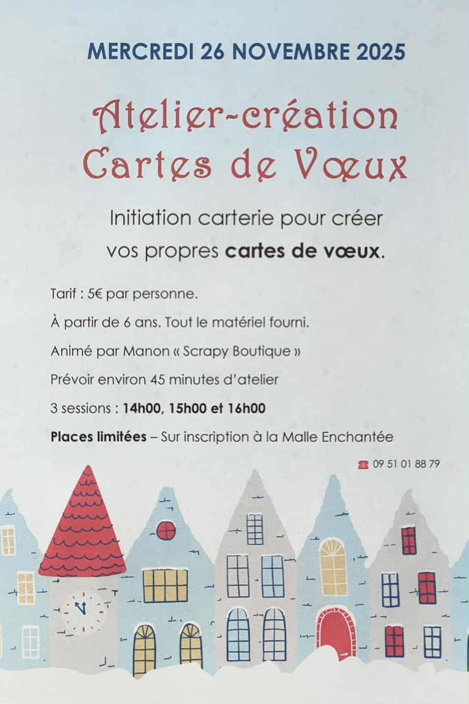 Laissez parler votre créativité et plongez dans la magie des fêtes ! La Malle Enchantée à Saint-Junien vous invite à un atelier de carterie animé par Manon de “Scrapy Boutique”. En famille ou entre amis, apprenez à réaliser vos propres cartes de vœux pleines de charme et de personnalité. Tout le matériel est fourni, il ne reste qu’à apporter votre bonne humeur !