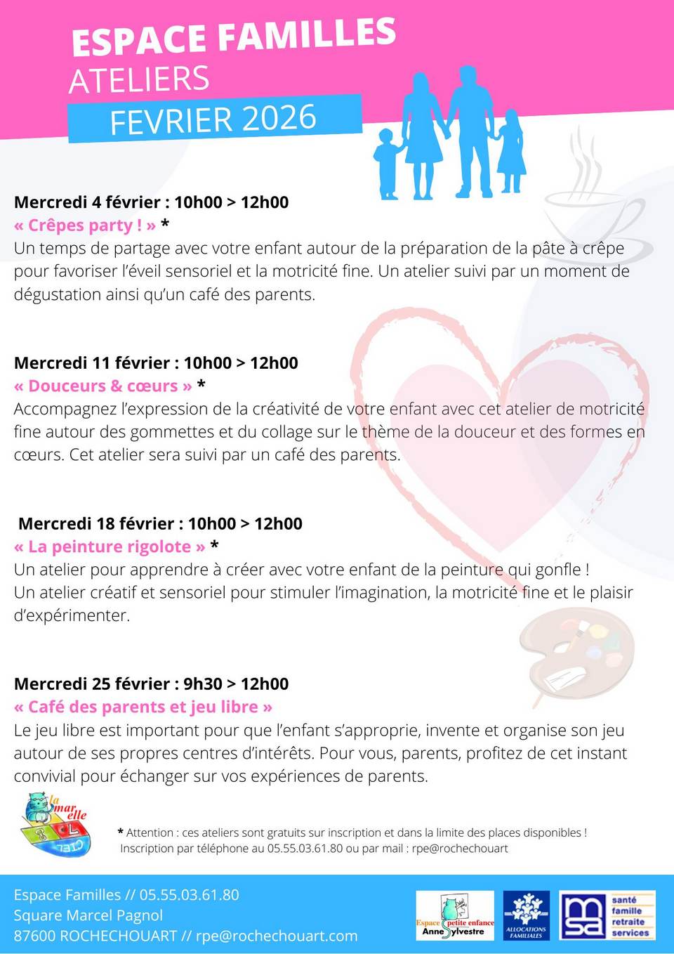 Proposé par l’Espace Familles de Rochechouart, cet atelier se prolonge par un café des parents, un temps d’échange convivial pour se retrouver, partager ses expériences et créer du lien. Un rendez-vous tout en tendresse, pensé pour le plaisir des enfants comme des parents.