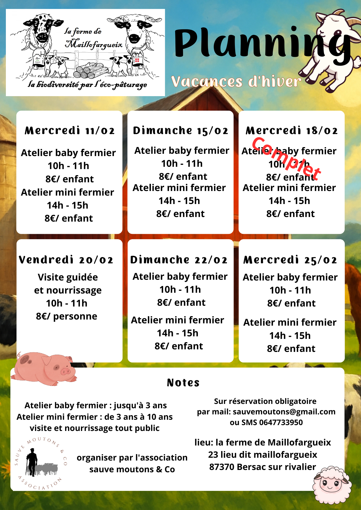 Le festin des bêtes : participez au nourrissage de nos animaux et entrez dans la bergerie pour une rencontre privilégiée avec les agneaux. Moment complice : un atelier brossage avec nos ânes, vaches et chevaux pour apprendre à prendre soin d’eux tout en douceur. Main verte : laissez une trace de votre passage en participant à la plantation d’arbres ou d'arbustes à la ferme.