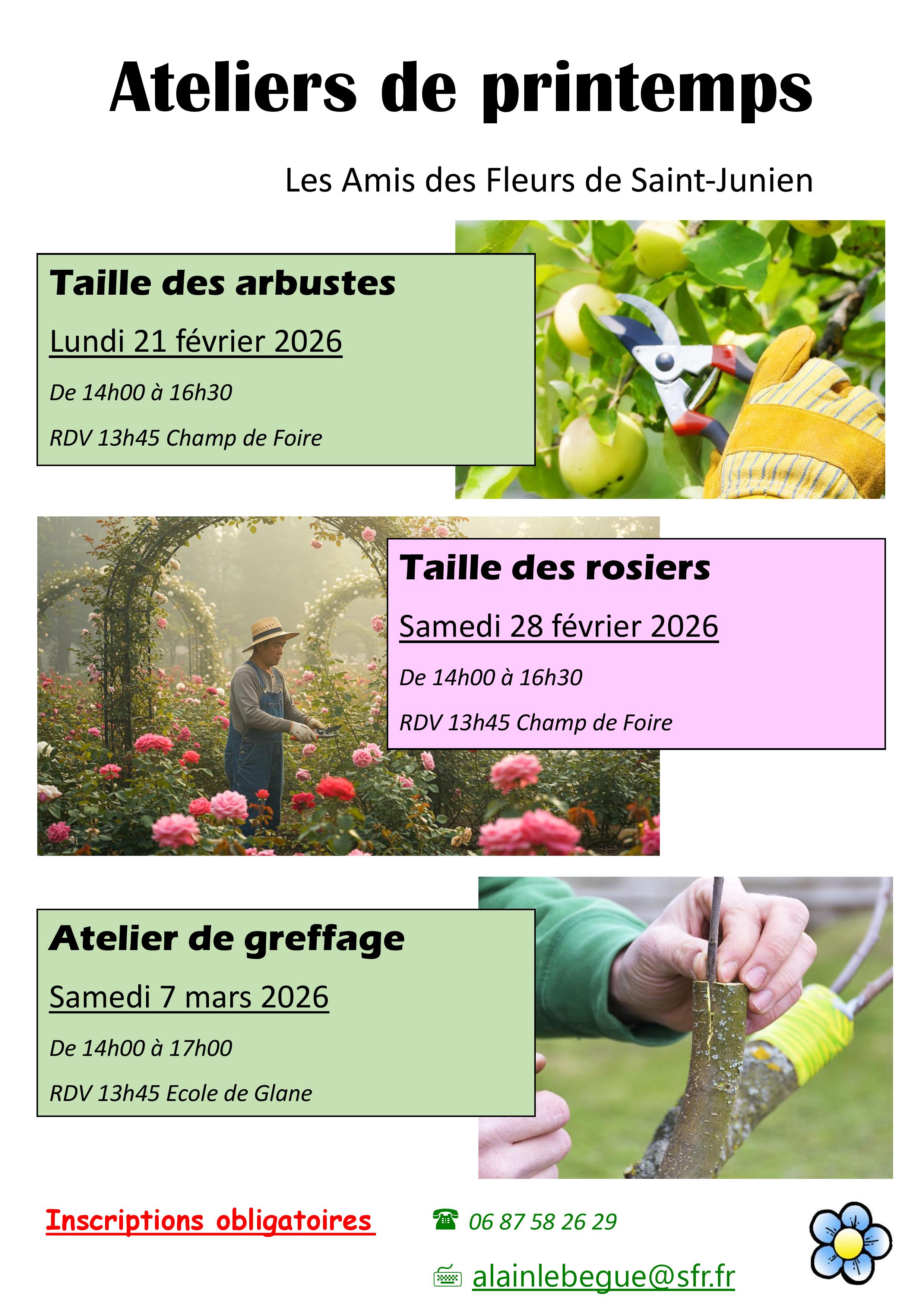 L'association Les Amis des Fleurs de Saint-Junien a le plaisir de vous convier à l'atelier "Taille des arbustes". Envie d’apprendre à tailler vos arbustes comme un pro ? Rendez-vous place du Champ de Foire. Nos experts vous guideront pas à pas pour que vos plantes s’épanouissent toute l’année. Un moment convivial pour partager astuces et passion du jardinage !