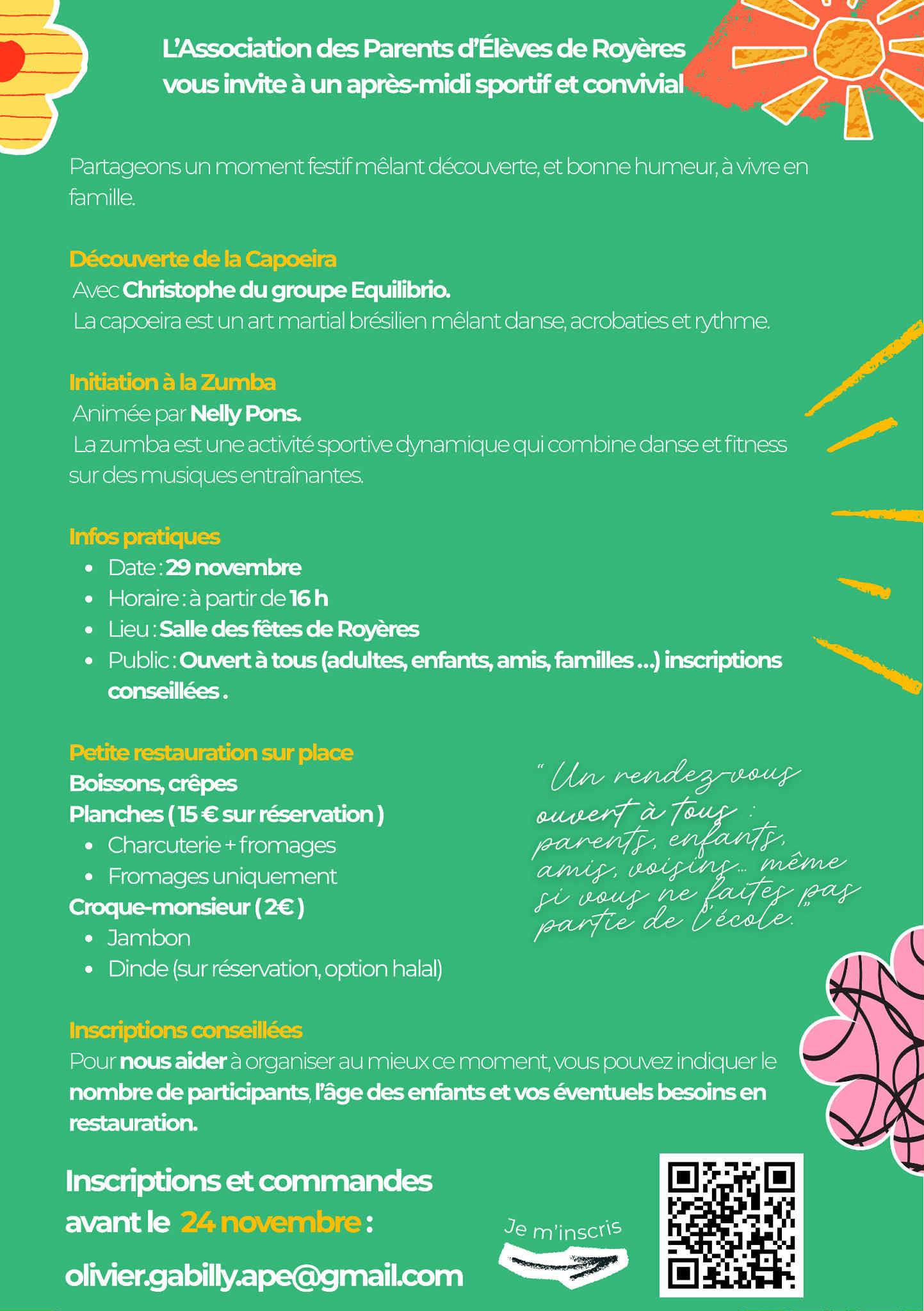 Au programme : Initiation capoeira, session zumba pleine d’énergie, planche apéro et croque-monsieur, boissons sur place. Venez nombreux profiter de cette soirée sportive et conviviale.