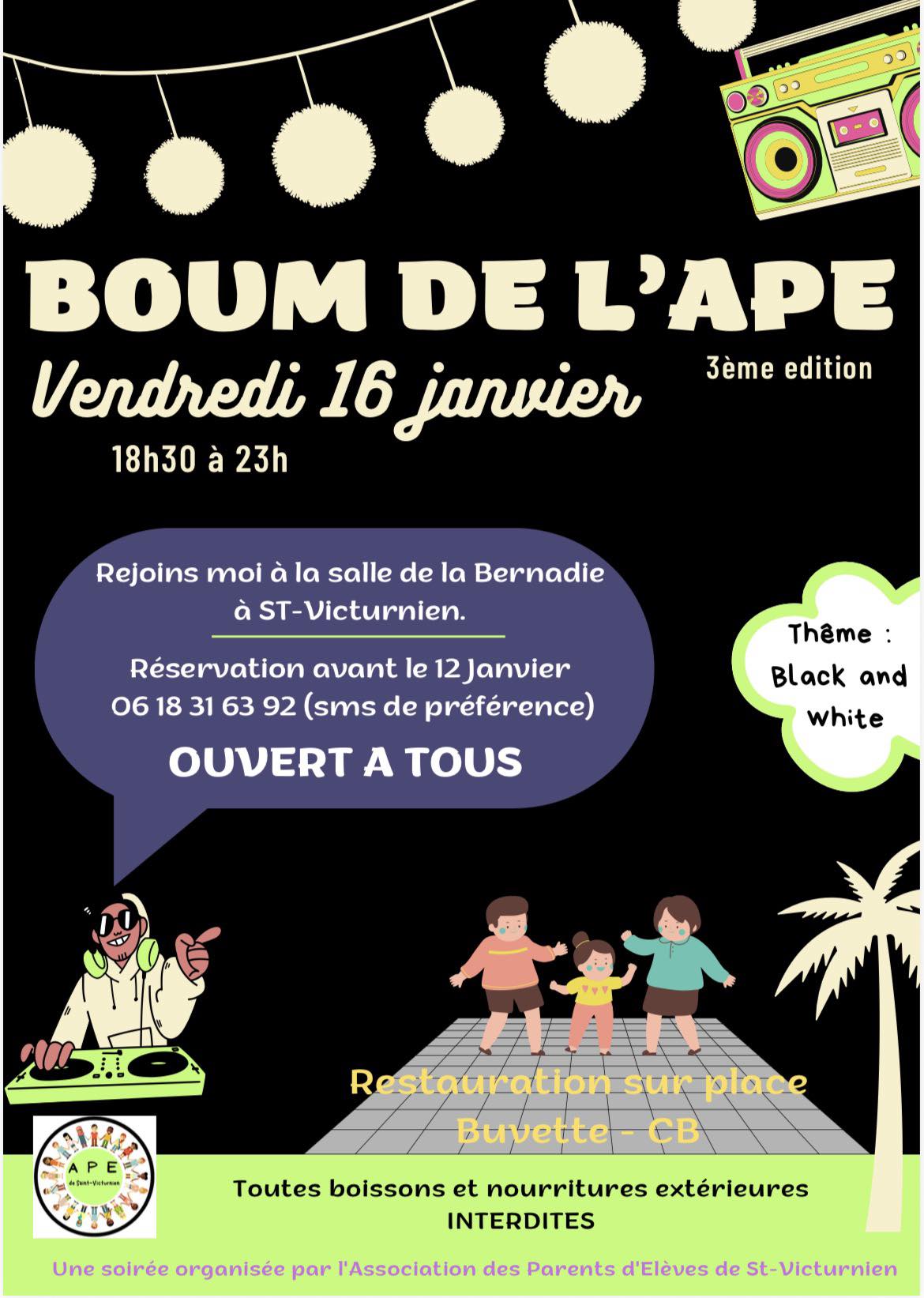 Vous l’attendiez, l’APE l’a organisée ! Cette année encore, aura lieu la boum de l’APE, en partenariat avec MaÏa Thomas, Jérôme de Ambiance Tchic et Tchac et La Petrie LH Boulangerie de St Victurnien.
