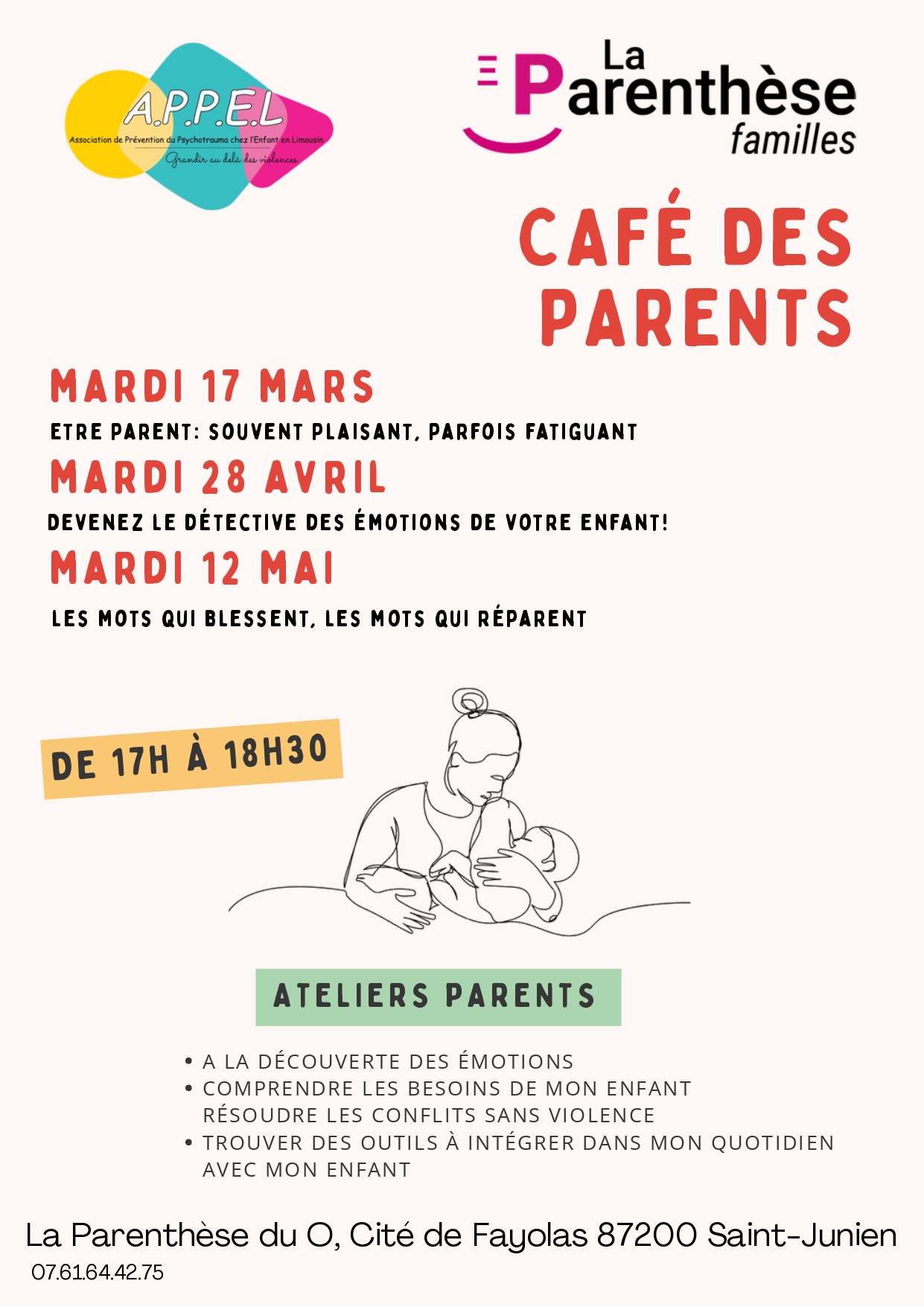 Être parent est une mission passionnante, mais aussi parfois épuisante. Pour vous accompagner dans ce quotidien intense, La Parenthèse familles et l'association A.P.P.E.L vous invitent à un cycle de rencontres dédié au soutien à la parentalité à Saint-Junien.