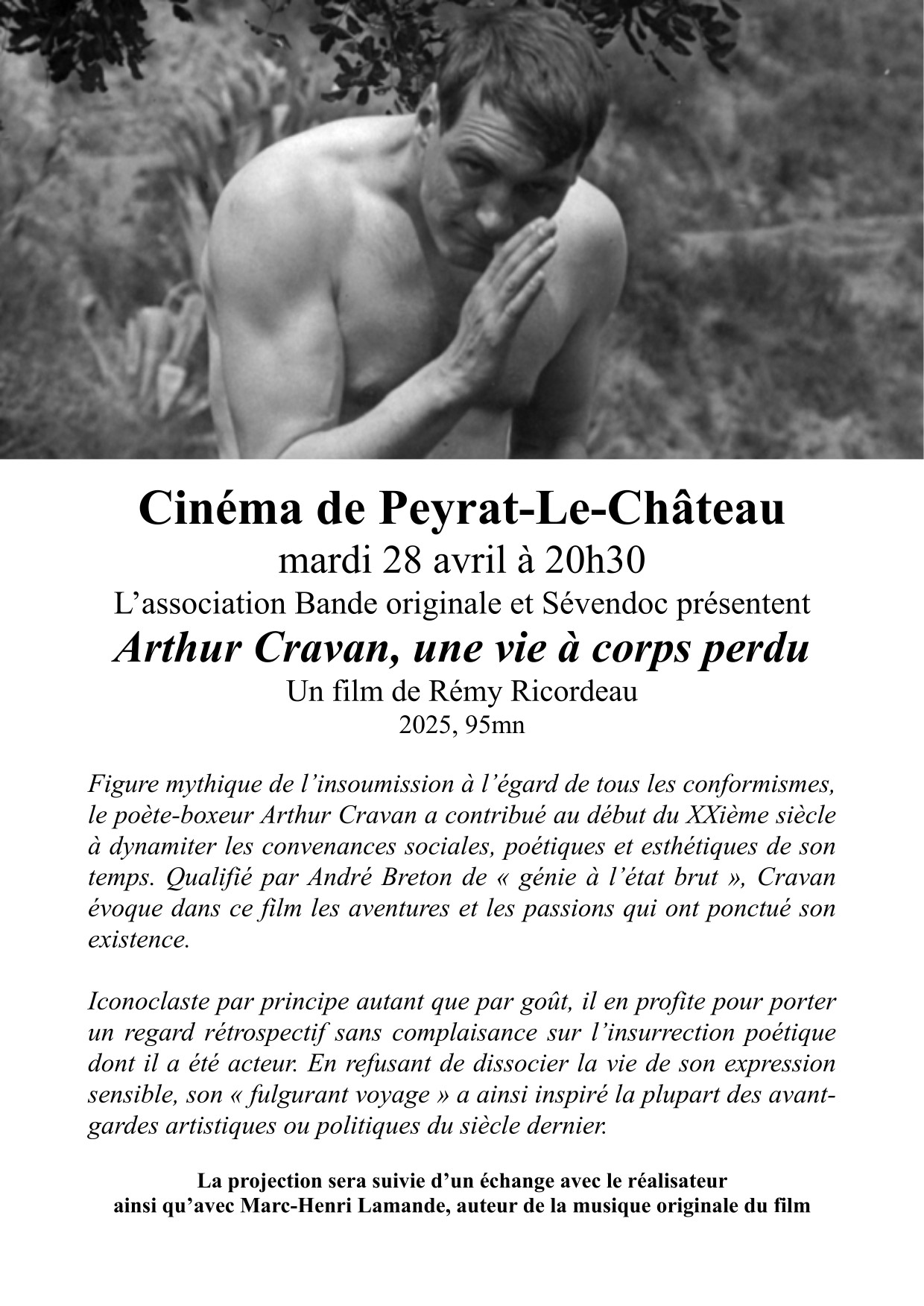 Projection du documentaire Arthur Cravan, une vie à corps perdu de Rémy Ricordeau suivie d'une discussion avec le réalisateur et l'auteur de la musique originale du film, Marc-Henri Lamande.