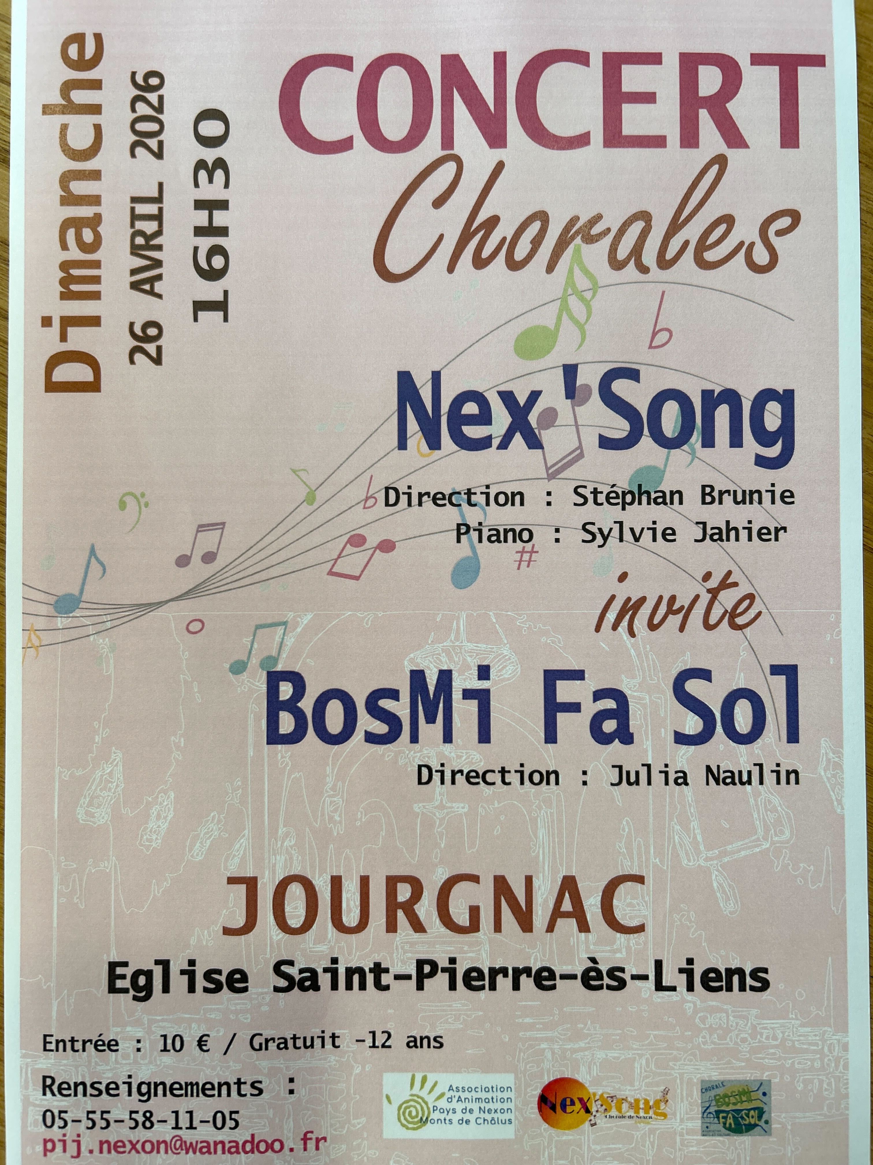 L’église Saint-Pierre-ès-Liens de Jourgnac accueille un concert de chorales placé sous le signe de l’émotion et du partage. L’ensemble Nex’Song, dirigé par Stéphan Brunie avec Sylvie Jahier au piano, invite la chorale BosMi Fa Sol sous la direction de Julia Naulin pour une rencontre musicale chaleureuse. Dans le cadre intimiste et patrimonial de l’église, les voix se mêlent pour offrir un moment de convivialité, de sensibilité et d’harmonie. Un rendez-vous ouvert à tous, entre répertoire choral et plaisir de chanter ensemble.