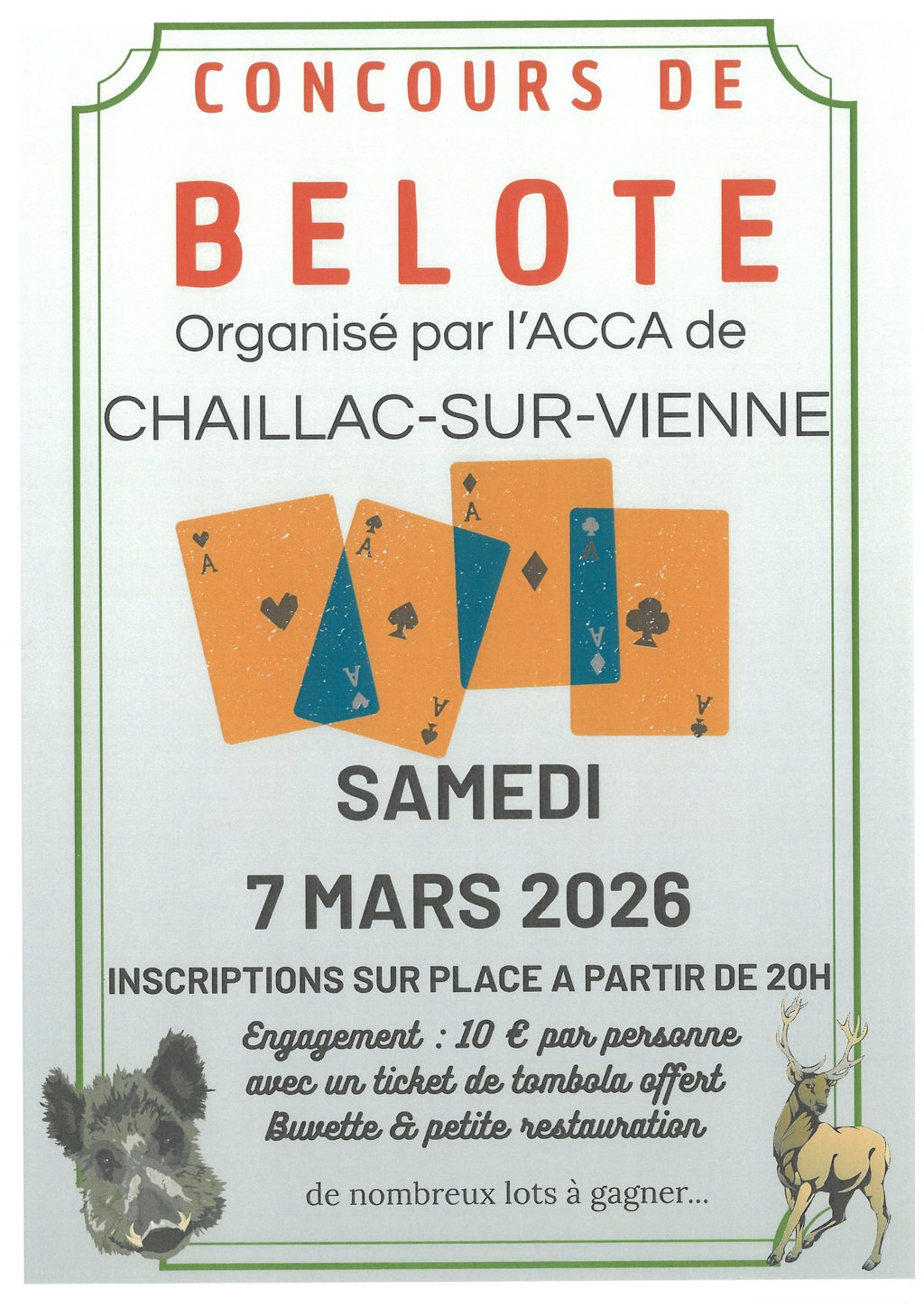 L'Association ACCA de Chaillac-sur-Vienne vous a concocté un programme au top : une tombola alléchante, une buvette pour se désaltérer et une petite restauration pour garder les forces. Et surtout, de nombreux lots à gagner pour les plus chanceux !