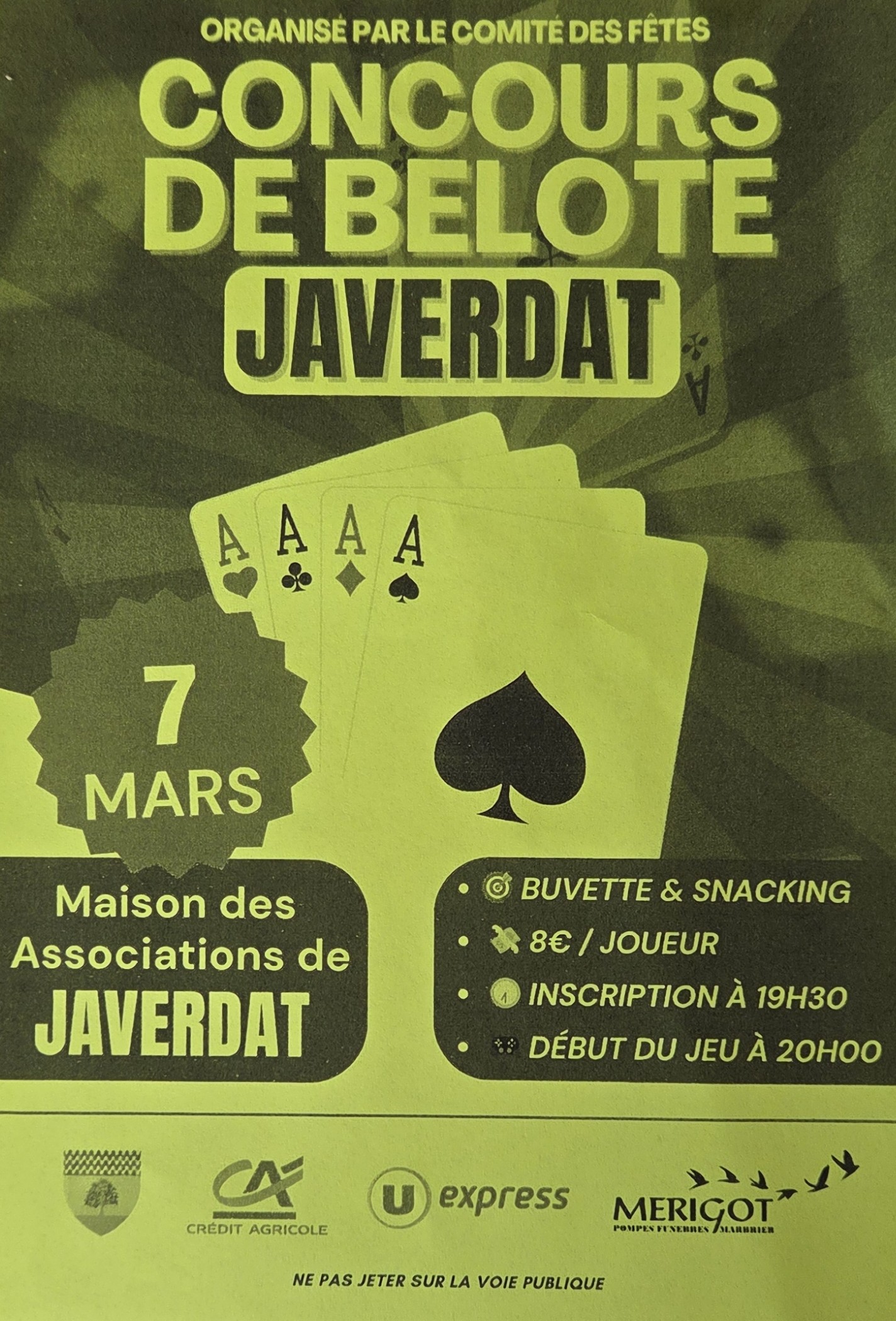 Le Comité des fêtes de Javerdat vous invite à son rendez-vous annuel : le traditionnel concours de belote ! Que vous soyez un pro de la "coinche" ou un amateur de bonnes cartes, venez taper le carton dans une ambiance chaleureuse et ultra-animée.