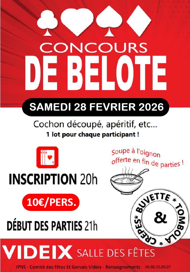 Plongez dans une ambiance chaleureuse et ludique avec le concours de belote qu'organise le Comité des Fêtes de Videix ! Une soirée où rires, stratégie et bonne humeur sont au rendez-vous. Chaque participant repartira avec un lot, et une savoureuse soupe à l’oignon sera offerte pour clore la soirée en douceur.