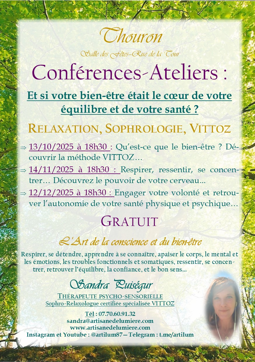 Conférence et atelier en compagnie de Sandra Puiségur, thérapeute psycho-sensorielle, sophro-relaxologue certifiée spécialisée VITTOZ.