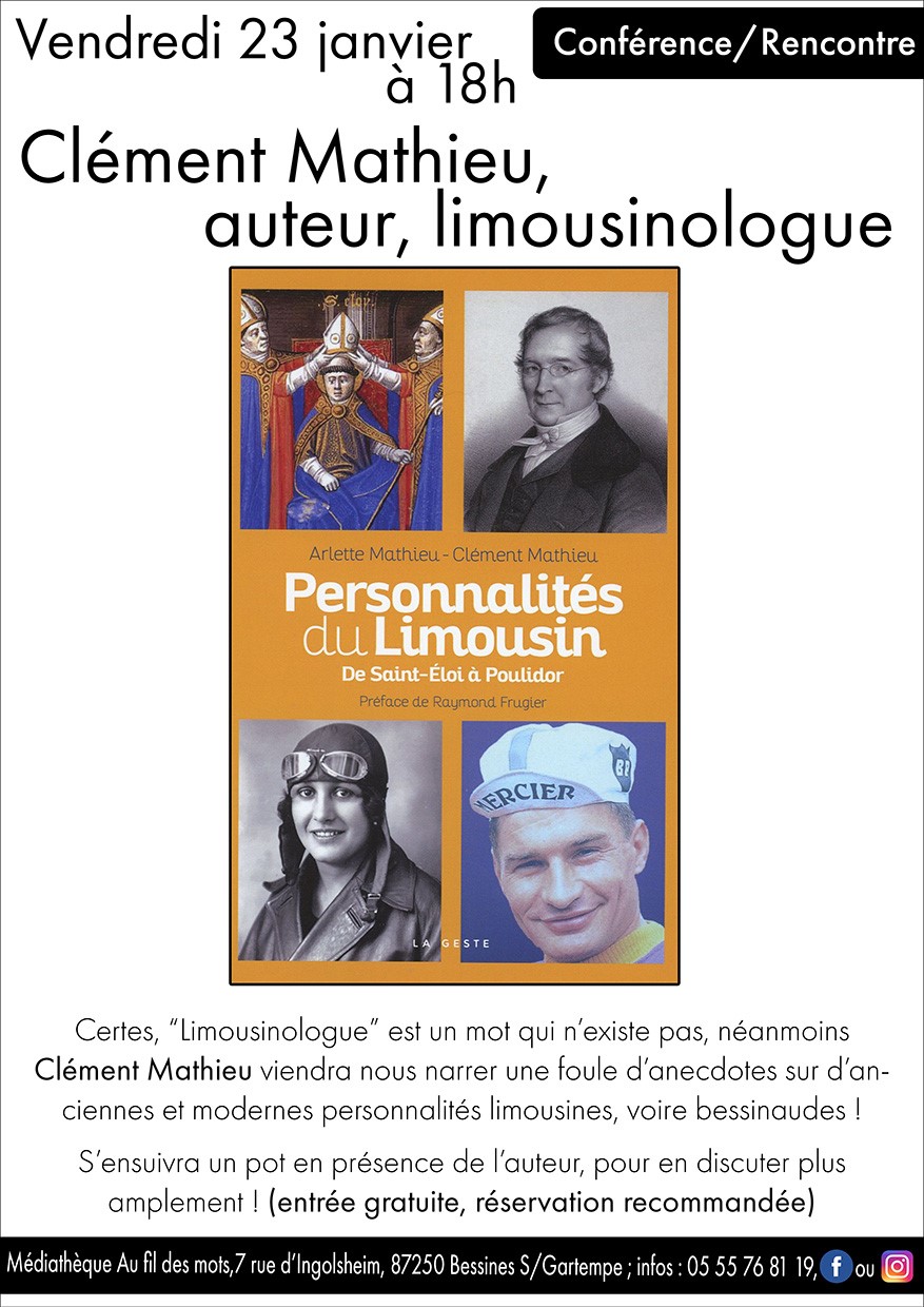 Certes, “limousinologue” est un mot qui n’existe pas, néanmoins Clément Mathieu vient nous narrer une foule d’anecdotes sur d’anciennes et modernes personnalités limousines, voire bessinaudes ! Un pot en présence de l’auteur s'ensuivra pour en discuter plus amplement !