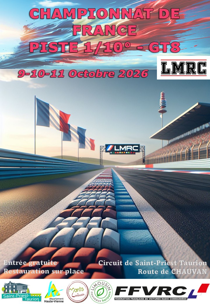 Le LMRC a le plaisir d’accueillir le Championnat de France GT8 pour 3 jours de compétition au plus haut niveau national, avec les meilleurs pilotes français. Un événement organisé sous l’égide de la FFVRC, avec le soutien des collectivités locales. Venez nombreux partager la passion de la voiture radiocommandée !