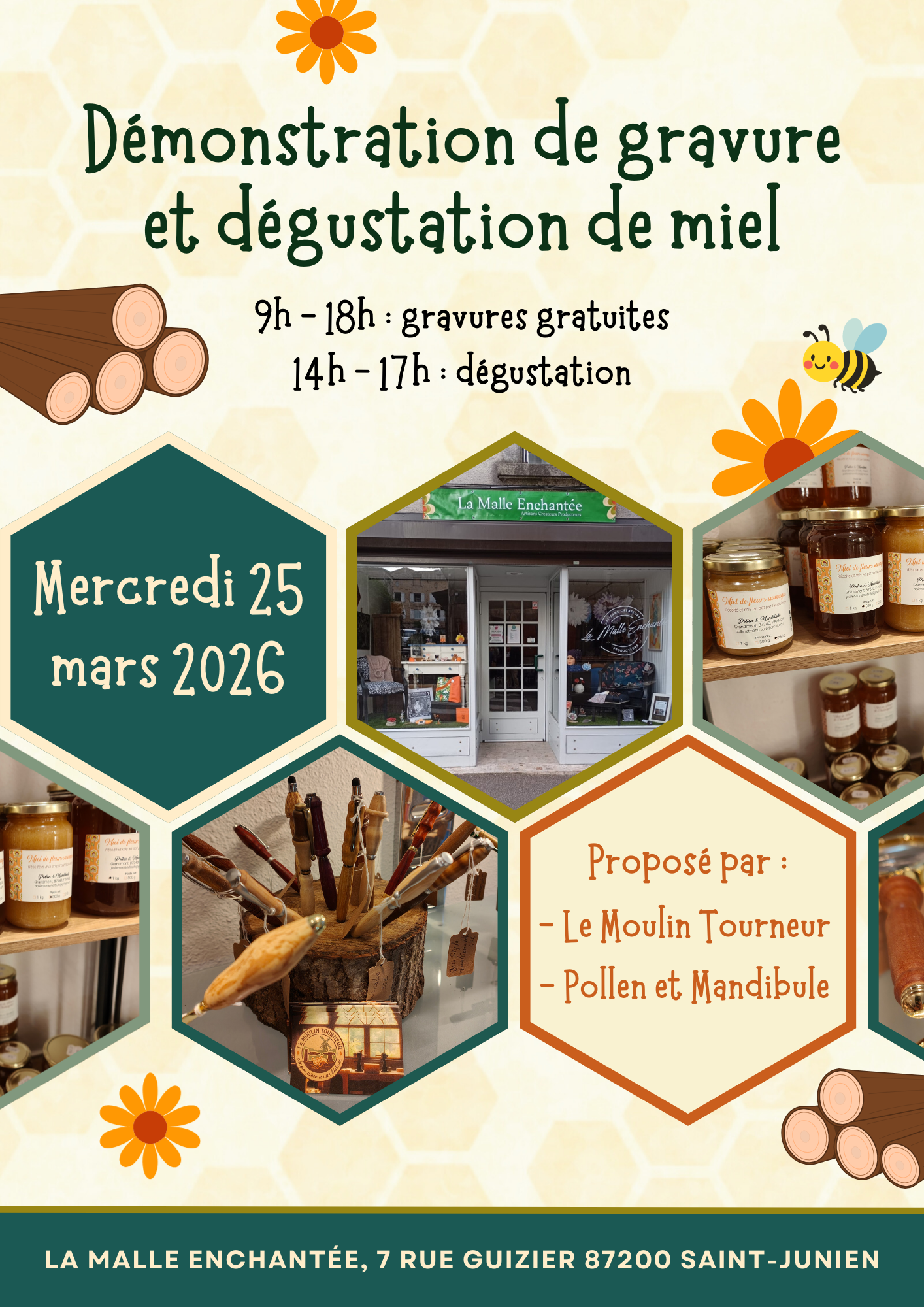 Plongez dans l'univers de l'artisanat local lors d'une journée à La Malle Enchantée à Saint-Junien. Le Moulin Tourneur et Pollen Et Mandibule s'unissent pour vous offrir une expérience riche en découvertes et en saveurs.