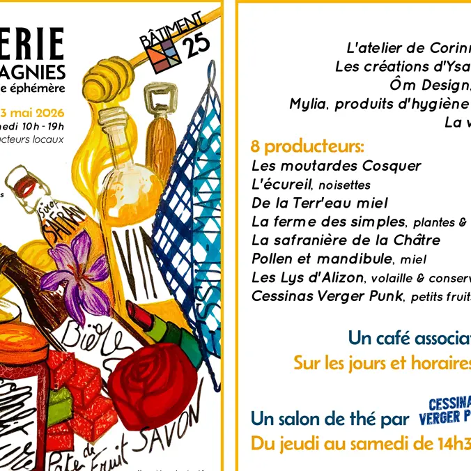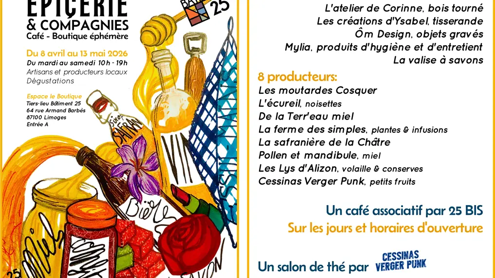 Découvrez une épicerie éphémère au Bâtiment 25 ! L’association 25 bis met à l’honneur les talents du Limousin avec une boutique dédiée aux produits 100% locaux : miel, huiles, savons et bien plus, créés par 14 artisans passionnés.