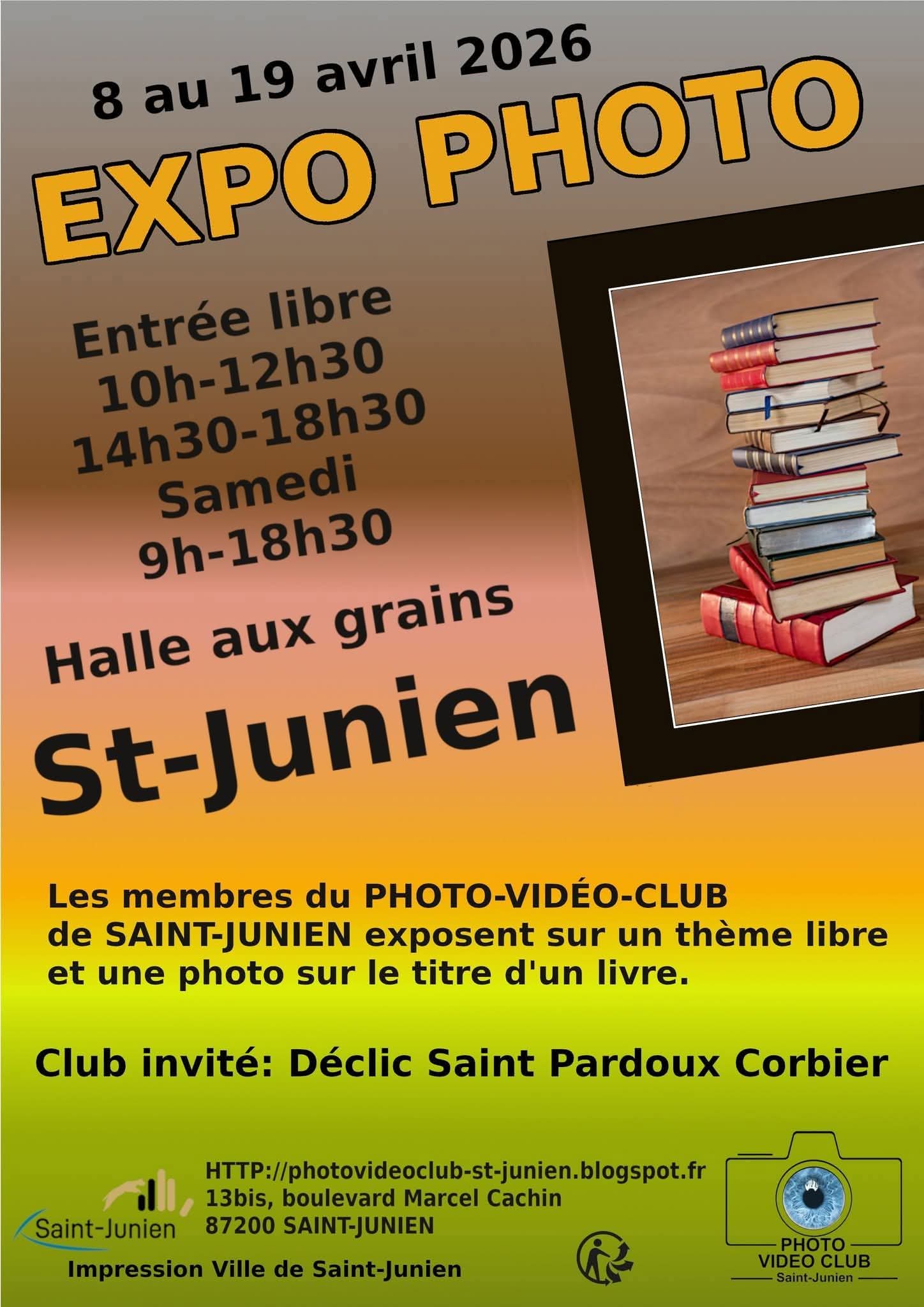 Les membres du Photo Vidéo Club de Saint-Junien présentent leur exposition annuelle. Chaque photographe expose 4 à 6 clichés sur un thème libre ainsi qu’une œuvre autour d’un thème imposé (titre de livre), offrant un panorama riche et varié de regards et de sensibilités. Vernissage le 8 avril à 18h.