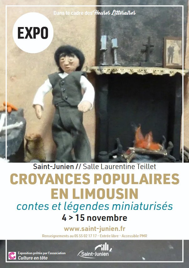 Plongez au cœur de l’imaginaire limousin ! Dans le cadre des Heures Littéraires, la Médiathèque de Saint-Junien accueille une exposition originale prêtée gracieusement par l’association Culture en tête : « Croyances populaires du Limousin », réalisée en partenariat avec l’association Culture en tête, vous invite à un voyage fascinant entre légendes et traditions. De délicates saynètes miniaturées font revivre les personnages mystérieux du folklore local : la Vieille du puits, Lo Leberon, la bête du bois et bien d’autres esprits qui hantent encore nos campagnes. Une exposition aussi poétique qu’étonnante, à découvrir en famille ou entre amis, pour retrouver le goût des histoires d’antan et percer les secrets de l’imaginaire rural limousin.