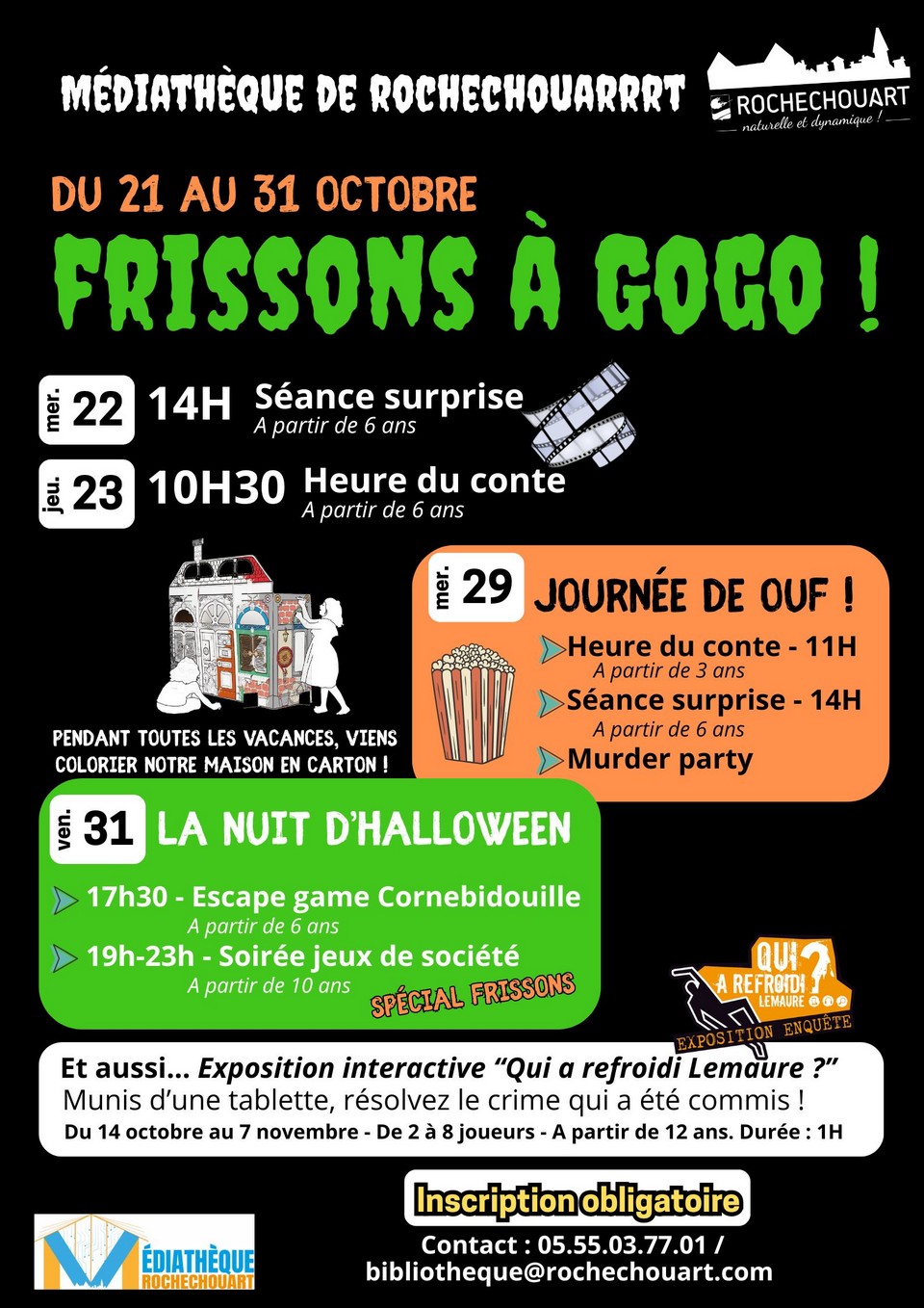 Frissons garantis à la Médiathèque de Rochechouart du 21 au 31 octobre ! Petits et grands sont invités à plonger dans une ambiance monstrueusement ludique : séances surprises, heures du conte, coloriages géants et même une « journée de ouf » le 29 octobre avec histoires, cinéma et murder party ! Le 31, place à « La nuit d’Halloween » avec un escape game Cornebidouille pour les 6 ans et +, suivi d’une grande soirée jeux de société spéciale frissons jusqu’à 23h. En prime, l’exposition-enquête interactive Qui a refroidi Lemaure ? vous mettra dans la peau d’un détective pour résoudre un crime à l’aide d’une tablette. Un programme plein de mystères, de rires et de frayeurs douces à partager en famille ou entre amis ! Pensez à réserver !