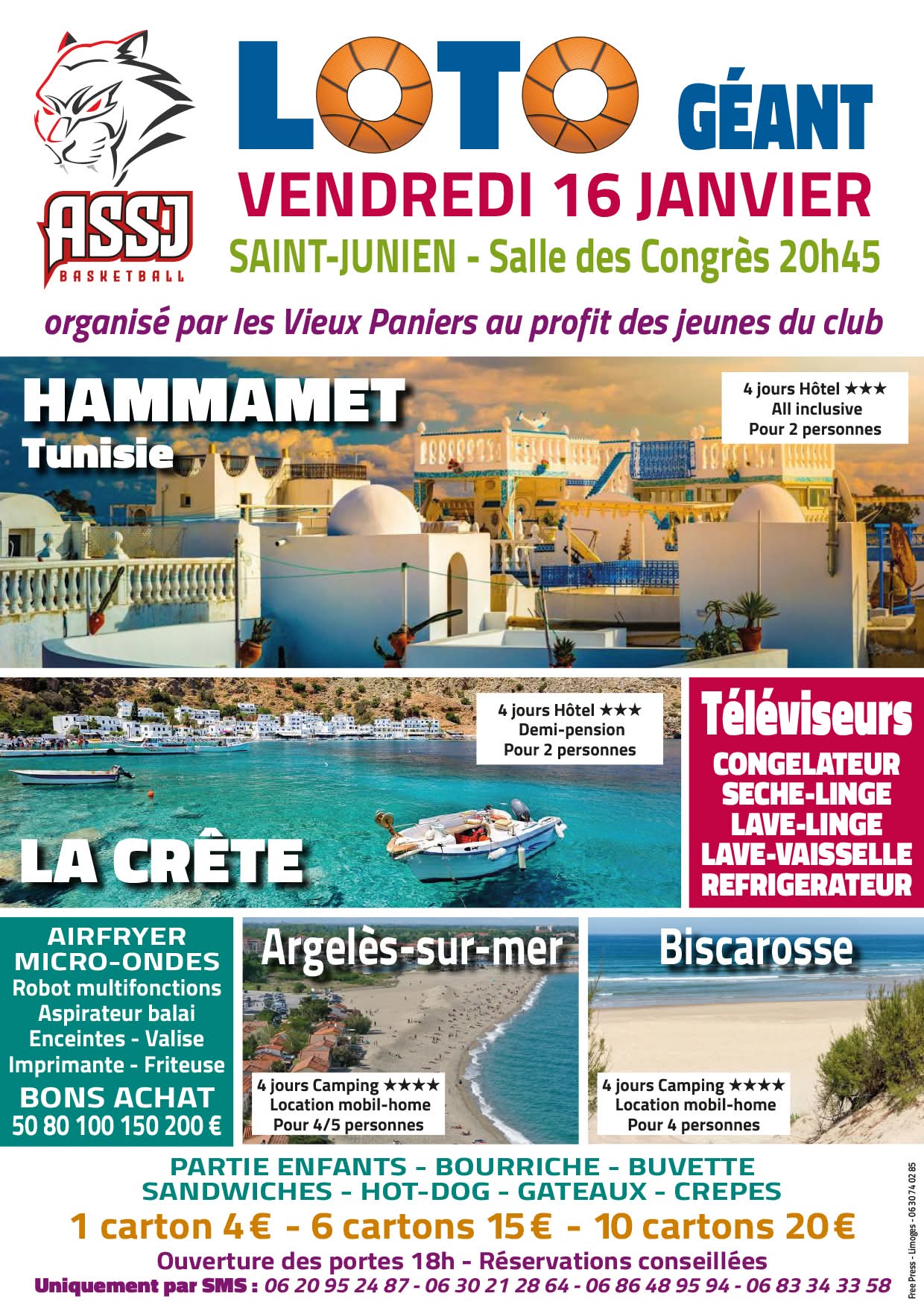 Envie de passer une soirée chaleureuse et divertissante ? L'ASSJ Basket de Saint-Junien vous invite à son grand loto ! Dans une ambiance conviviale, venez tenter votre chance et partager un bon moment entre amis, en famille ou entre voisins. De nombreux lots sont à gagner, de quoi repartir les bras chargés et le sourire aux lèvres ! C’est l’occasion idéale de se retrouver, d’échanger et de profiter d’une soirée simple et joyeuse, placée sous le signe de la bonne humeur.