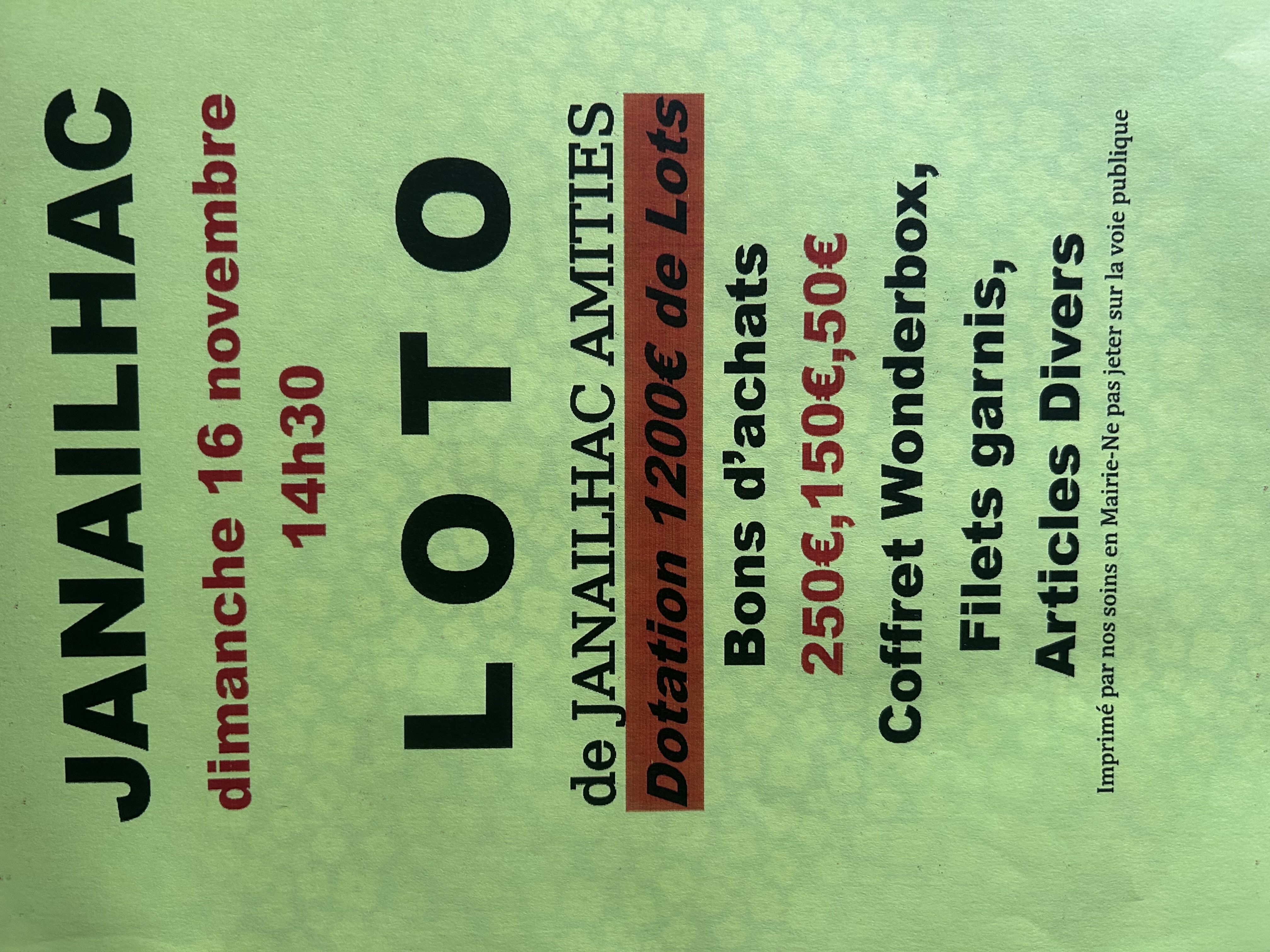 À l’occasion de son loto, l’association Janailhac Amitiés propose plus de 1 200 € de lots à gagner : bons d’achat de 250 €, 150 € et 50 €, coffret Wonderbox, filets garnis et de nombreux autres lots !