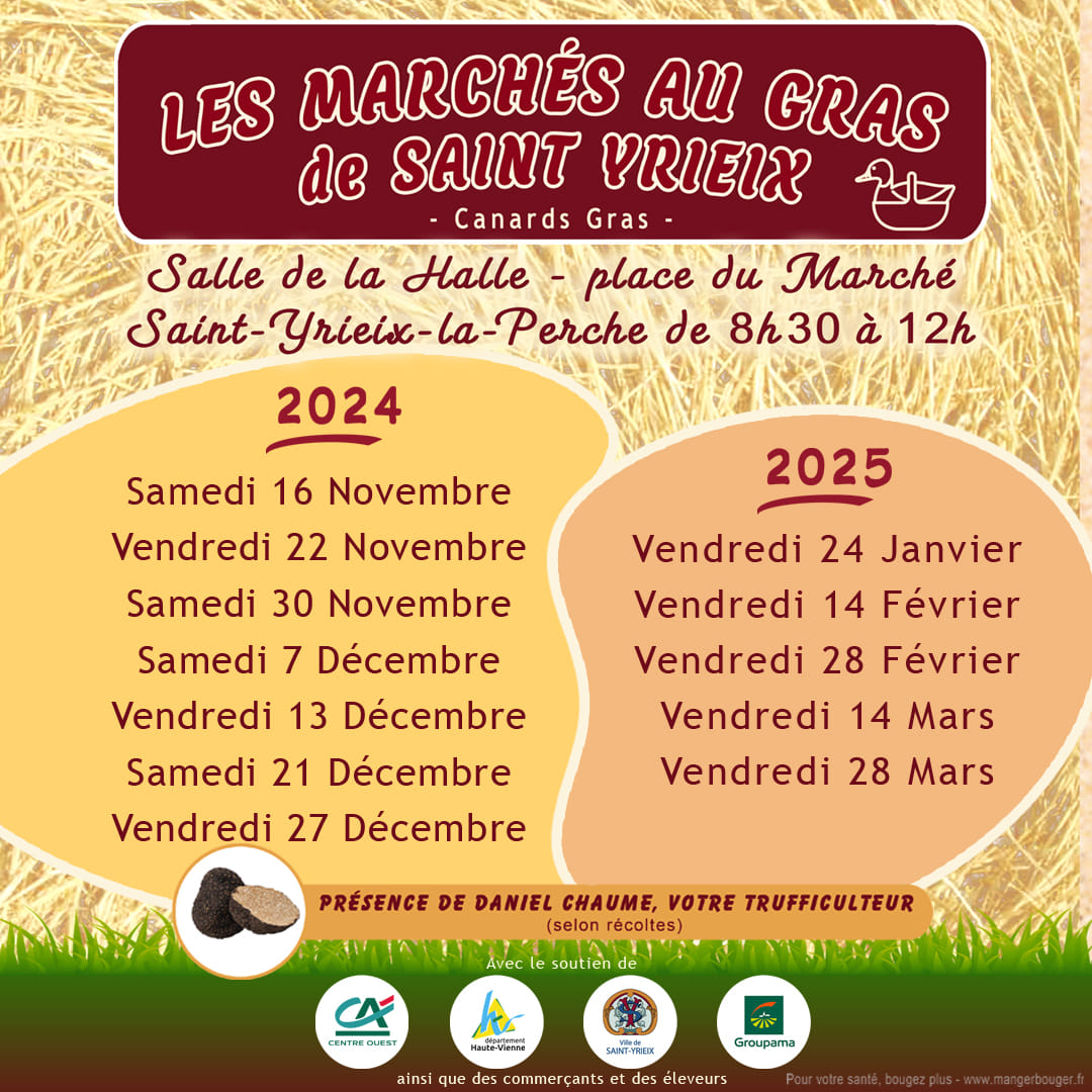 Au cœur de Saint-Yrieix-la-Perche, les Marchés au Gras célèbrent chaque hiver l’excellence du terroir limousin. Véritable rendez-vous des gourmets, ils mettent à l’honneur les canards gras, foies, confits et spécialités artisanales issues d’élevages locaux. L’ambiance y est conviviale, animée par les producteurs passionnés, les démonstrations culinaires, les dégustations et les concours primés. Truffes, produits fermiers et animations festives ravivent les sens dans une atmosphère authentique et généreuse. Depuis 1980, cette tradition gourmande incarne la fierté du Sud-Haute-Vienne et la richesse d’un savoir-faire paysan transmis avec passion. Un moment unique pour savourer le meilleur du goût limousin, rencontrer les artisans et vivre la convivialité d’un marché 100 % local et fermier.