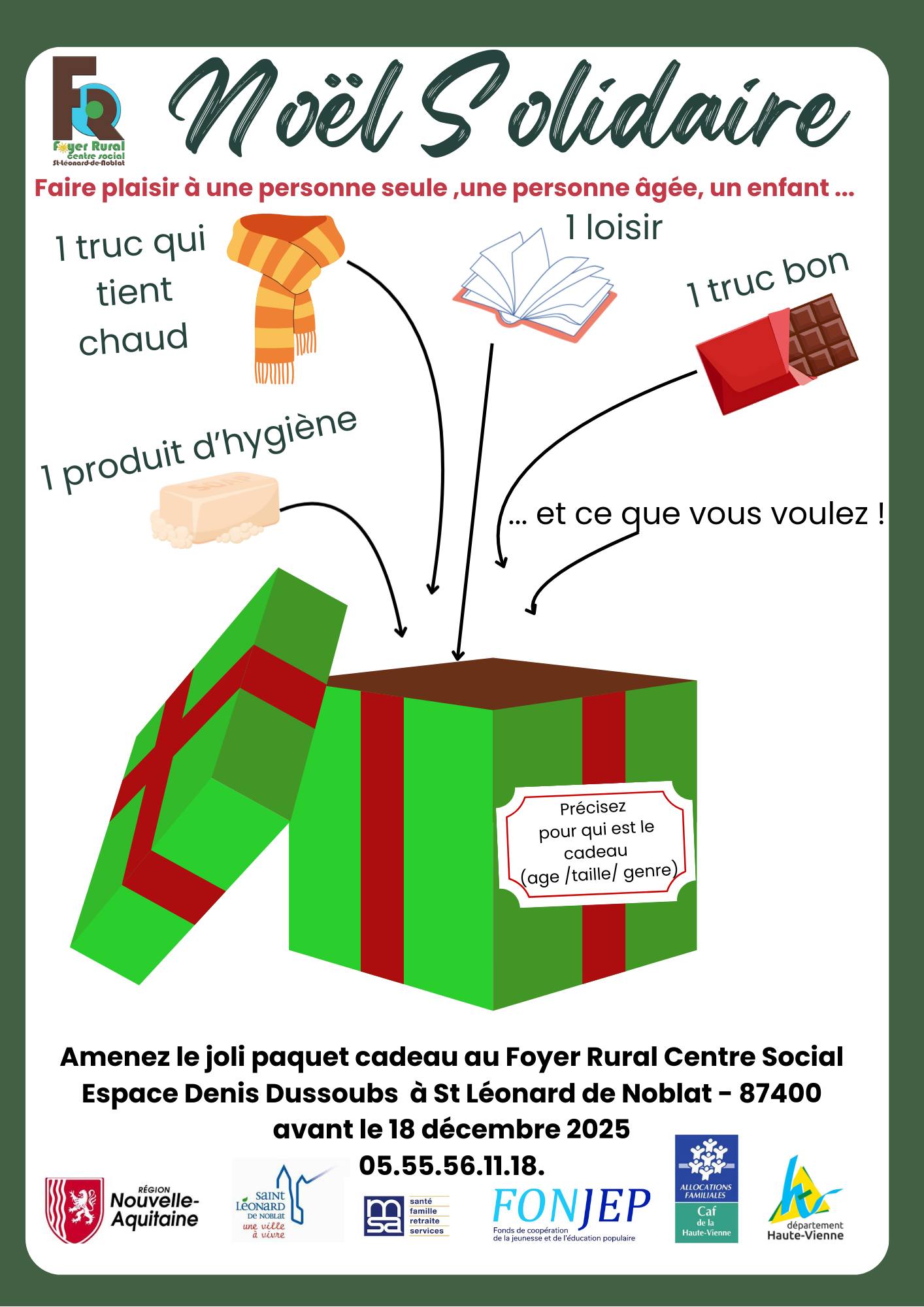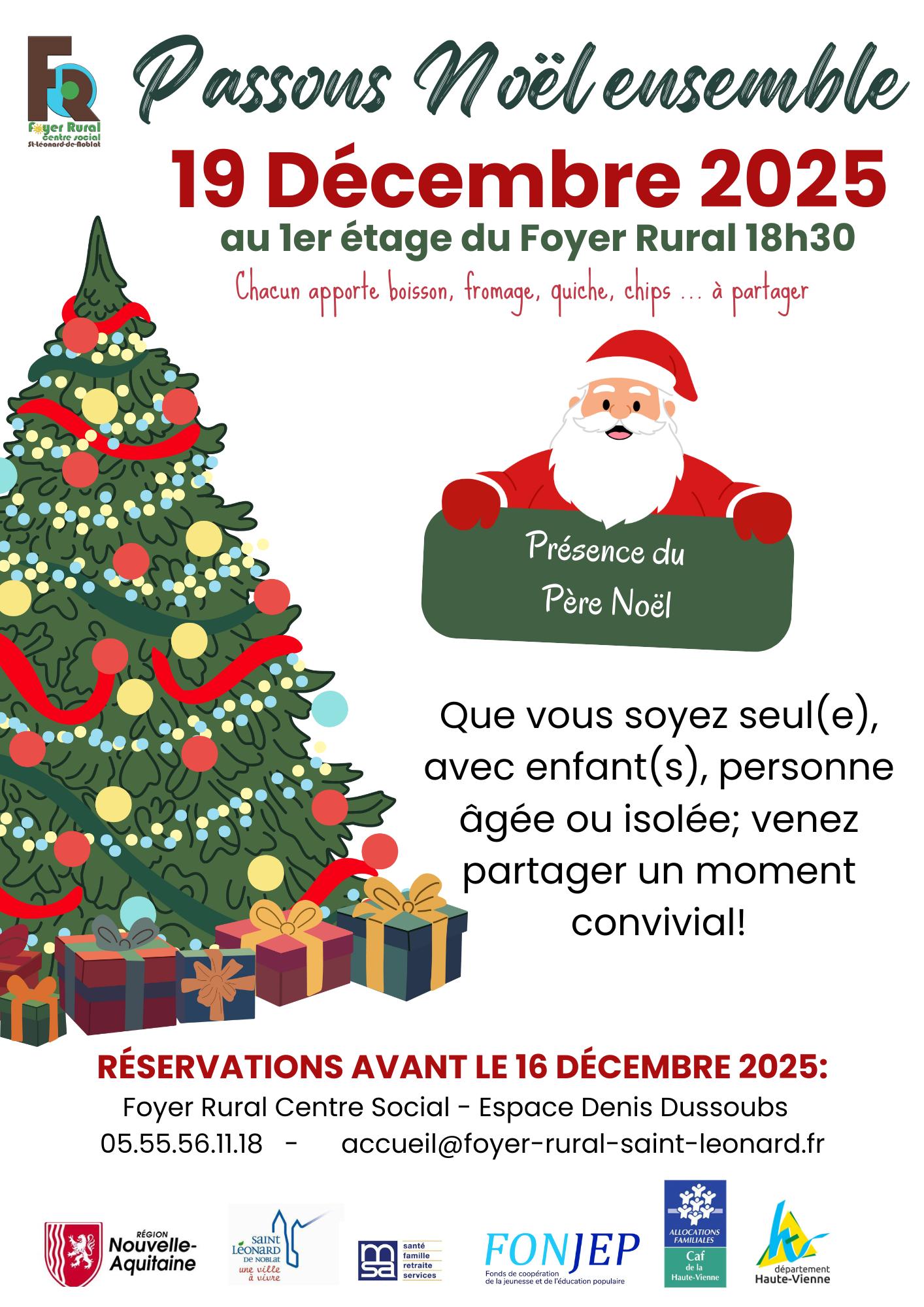 Le Foyer Rural de Saint-Léonard-de-Noblat vous invite à passer Noël entouré d'autres personnes. Que vous soyez seul(e), avec enfant (s), personne âgée ou isolée, venez partager un moment convivial. Chacun amène boisson, fromage, quiche, chips..