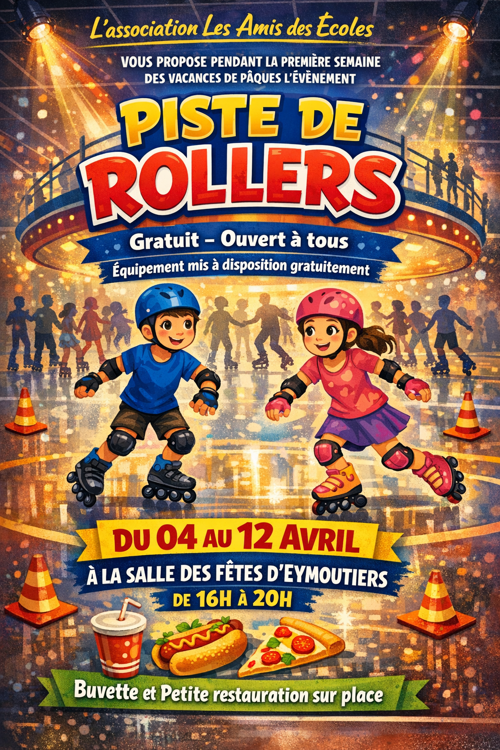 Pendant la première semaine des vacances de Pâques, venez profiter d'une piste de roller ouvert à tous dans une ambiance conviviale. L'entrée est gratuite et l'équipement est mis à disposition gratuitement. Que vous soyez débutant ou confirmer, venez rouler, s'amuser et passer un bon moment entre amis ou en famille. Buvette et petite restauration sur place pour profiter pleinement.
