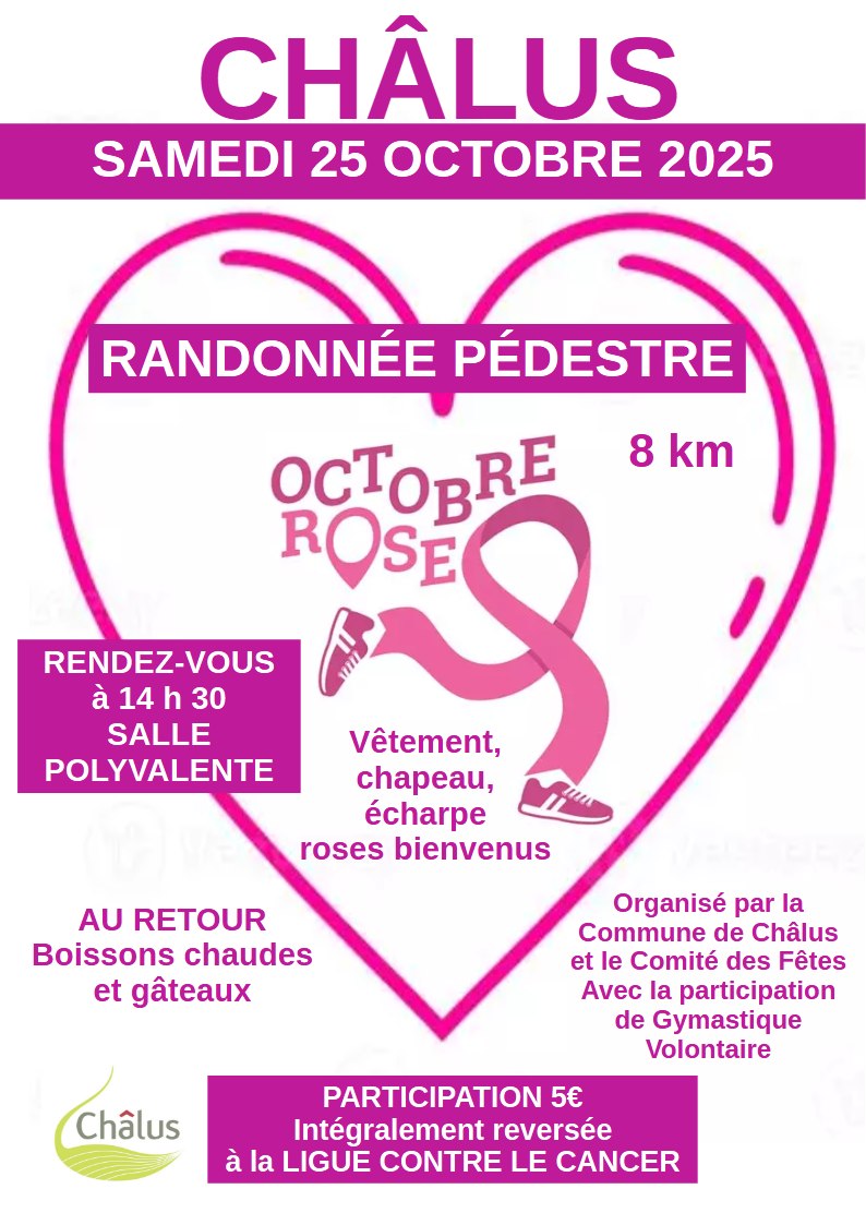 La commune de Châlus et le Comité des Fêtes, avec la participation de Gymnastique Volontaire, organisent une randonnée pédestre de 8 km dans le cadre d’Octobre Rose. Rendez-vous à la salle polyvalente. Les participants sont invités à porter des vêtements, chapeaux ou écharpes roses pour marquer l’événement. Au retour, boissons chaudes et gâteaux seront proposés. La participation de 5 € sera intégralement reversée à la Ligue contre le cancer, pour soutenir la lutte contre le cancer du sein. Une belle occasion de se mobiliser pour la santé tout en profitant d’une sortie conviviale et sportive.