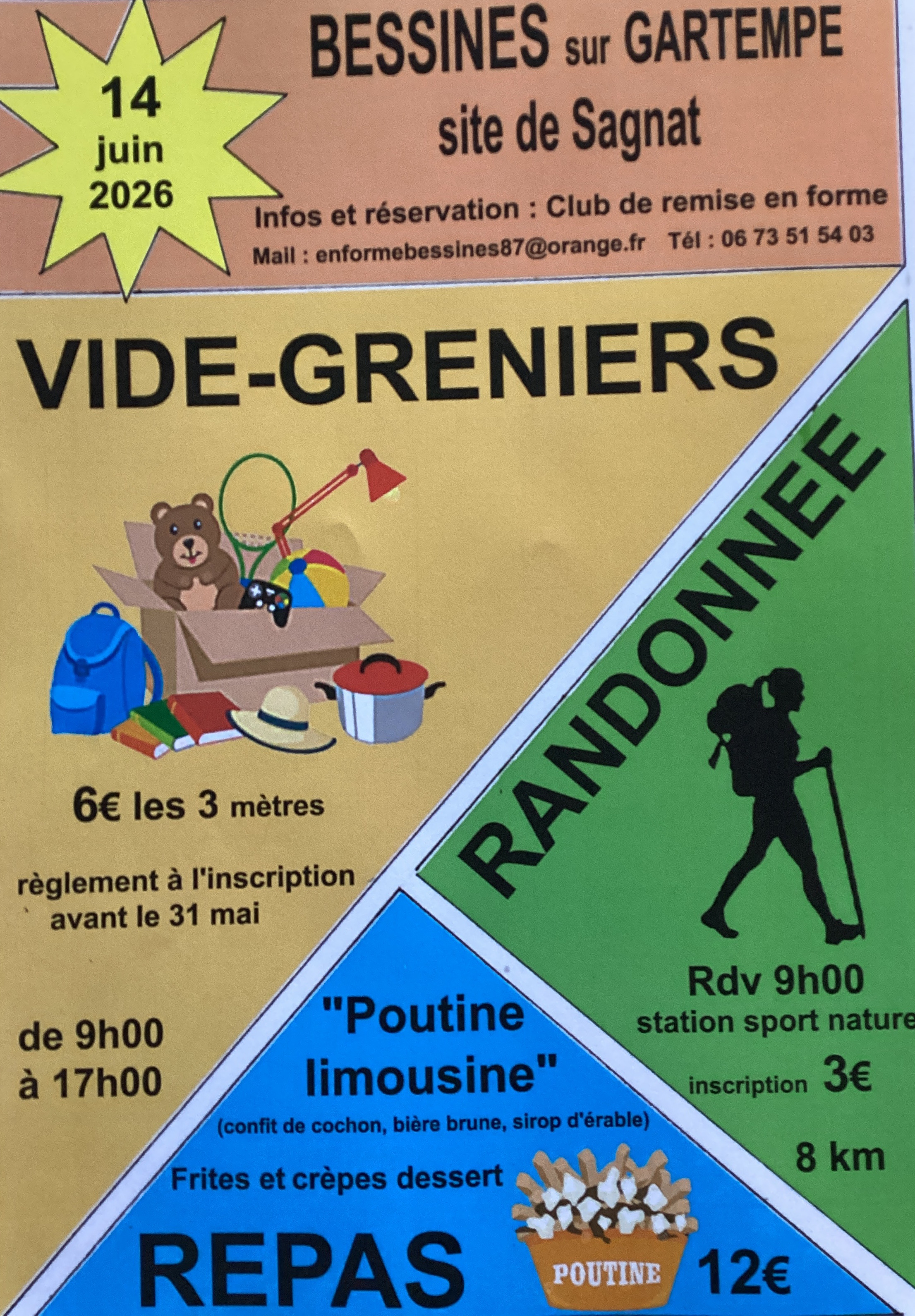 Sur le magnifique site de Sagnat, au bord du lac, randonnée de 8km pour découvrir la campagne environnante. Flâner au vide grenier brocante pour chiner au grand air près du bord de l’eau et faire des trouvailles. Et pause déjeuner avec une poutine (porc confit dans de la bière brune et du sirop d’érable) accompagnée de frites et en dessert une crêpe toute chaude. Inscrivez vous !!!! Et réservez votre journée. Venez nous rejoindre pour allier sport, détente, achat de deuxième main…