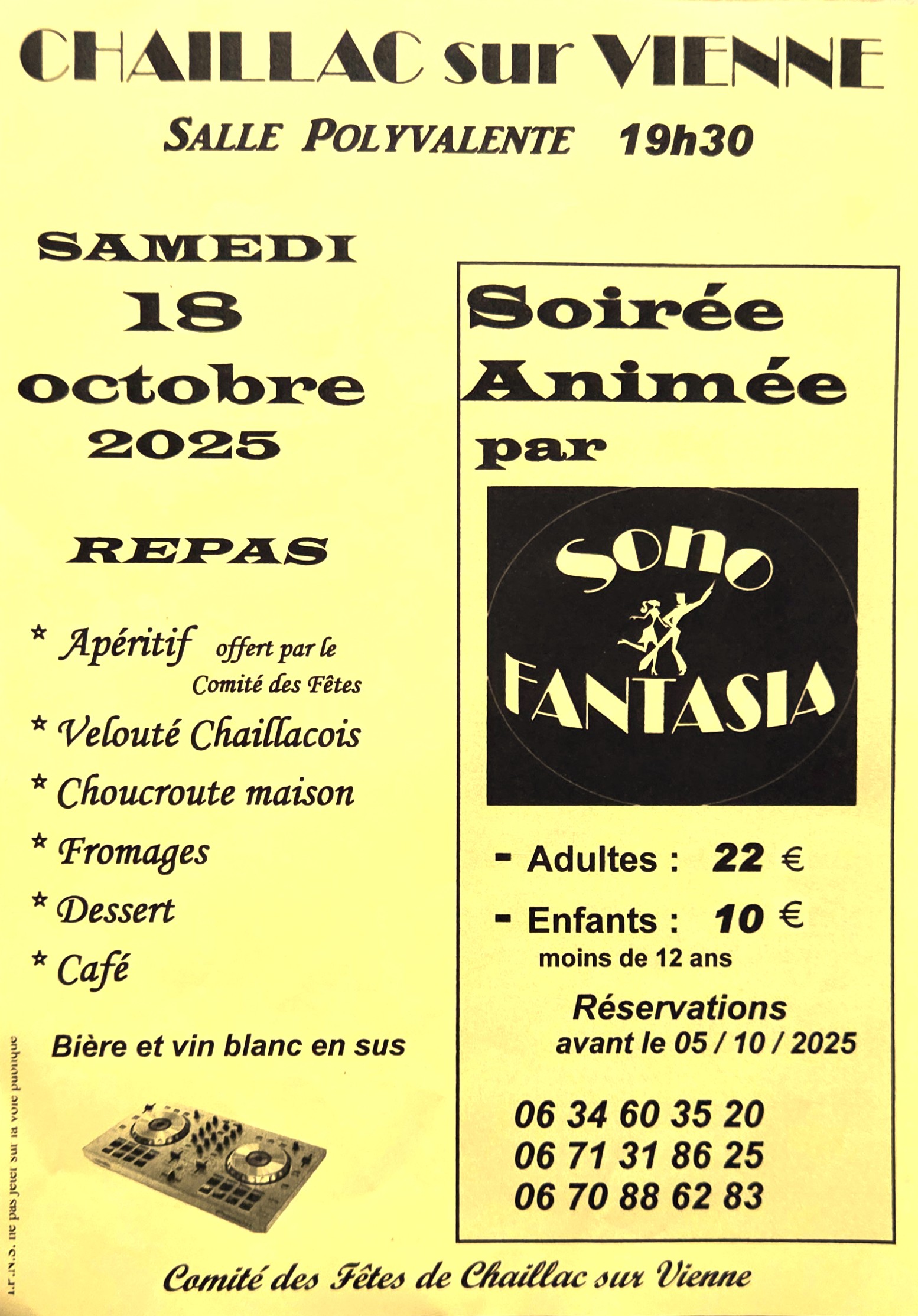 Le Comité des Fêtes de Chaillac-sur-Vienne vous convie à une soirée placée sous le signe de la convivialité et de la bonne humeur ! Au programme : un Repas Dansant animé par Sono Fantasia, de quoi régaler vos papilles et vous faire vibrer sur la piste. Que vous veniez en couple, entre amis ou en famille, c’est l’occasion idéale de se retrouver, de rire et de partager ensemble des instants joyeux. Ambiance festive garantie pour prolonger le plaisir sans se presser ! Pensez à réserver avant le 5 octobre pour être sûr de profiter de cette belle soirée de fête.
