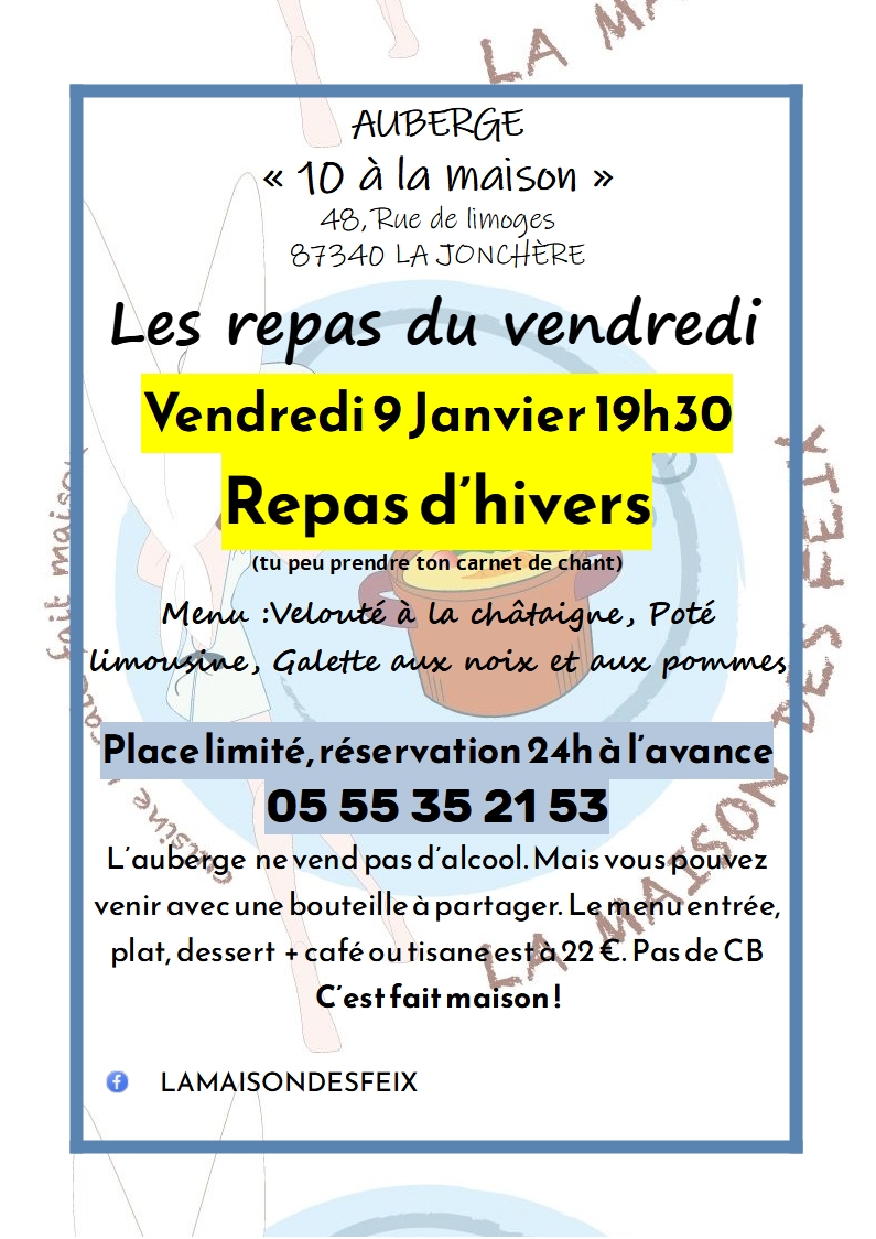 Les repas du vendredi, c'est un repas convivial autour d'un menu à thème. C'est un moment de rencontre dans un lieu atypique, une grande table, des bancs, une grande cheminé allumée pour l'occasion. Ce mois-ci nous avons sélectionné un menu d'hiver, concocter avec les produits de la région, tout est fait maison : velouté avec les châtaigne du coin, potée limousine (un plat traditionnel en hiver), galette feuilletée garnie de noix et de pommes.