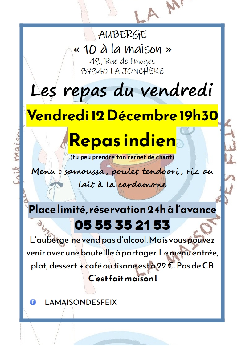 Tous les 2ème vendredi du mois, un repas à thème à La maison des Feix. Ce mois ci, c'est repas indien. Entrée : samoussas salade verte et sauce blanche à la menthe ; plat principale : poulet Tandoori et ses légumes à l'indienne ; dessert : riz au lait à la cardamone.