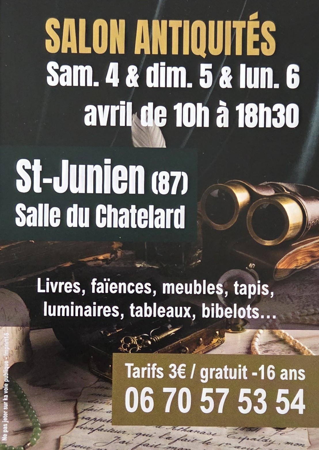 Le salon des antiquaires de Saint-junien est devenu un grand rendez-vous pour les amateurs de meubles, bibelots, linges, et autres articles anciens de valeurs. Venez dénicher des trésors et faire de bonnes affaires !