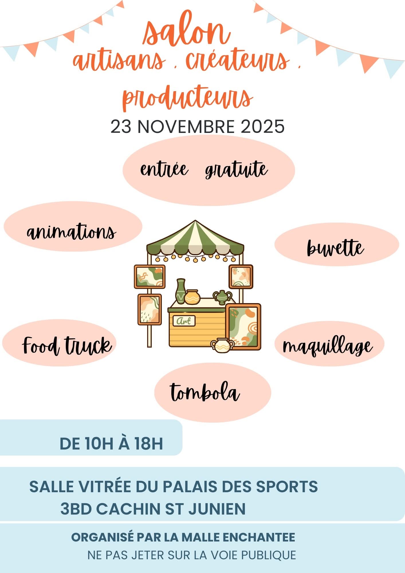 Le Palais des Sports de Saint-Junien se transforme en véritable caverne aux merveilles ! Venez flâner dans la salle vitrée au Salon des Artisans, Créateurs et Producteurs, organisé par La Malle Enchantée. Poteries, bijoux, gourmandises, déco ou créations originales : un concentré de savoir-faire local à découvrir dans une ambiance chaleureuse et conviviale. Profitez d’un moment en famille ou entre amis avec des animations, un stand maquillage pour les enfants, une buvette, un food truck pour les petites faims, et une tombola pleine de surprises ! Venez encourager les talents d’ici et repartir la tête pleine d’idées et les bras chargés de trouvailles !