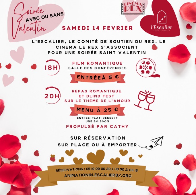Que vous soyez en couple, entre ami·es, en solo assumé ou simplement curieux·se, L’Escalier, le Comité de soutien du Rex et le cinéma Le Rex s’associent pour vous proposer une soirée Saint-Valentin conviviale, festive et décomplexée.