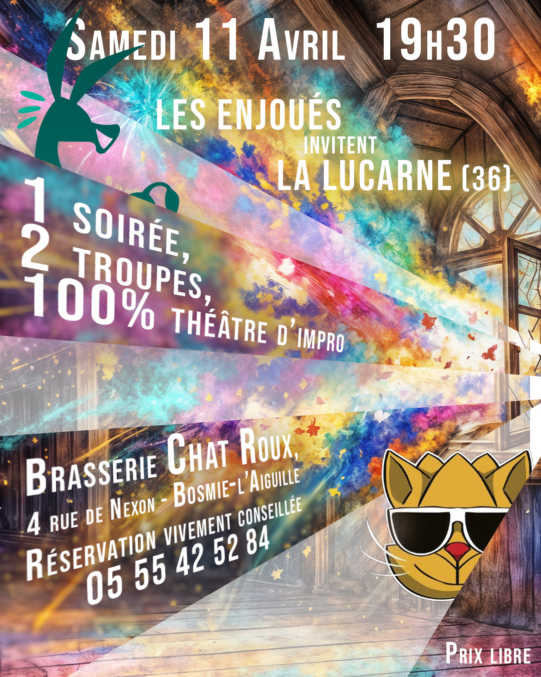 Les Enjoués accueillent La Lucarne pour une soirée 100 % improvisée placée sous le signe de la spontanéité, du rire et de la créativité. Deux troupes, deux spectacles, une seule promesse : vous surprendre à chaque instant ! Entre réparties inattendues, situations décalées et énergie communicative, laissez-vous embarquer dans l’univers vivant et imprévisible du théâtre d’improvisation. Sur place, profitez de bières locales et de planches de produits du terroir pour prolonger ce moment convivial. Participation à prix libre et conscient. Réservation conseillée.