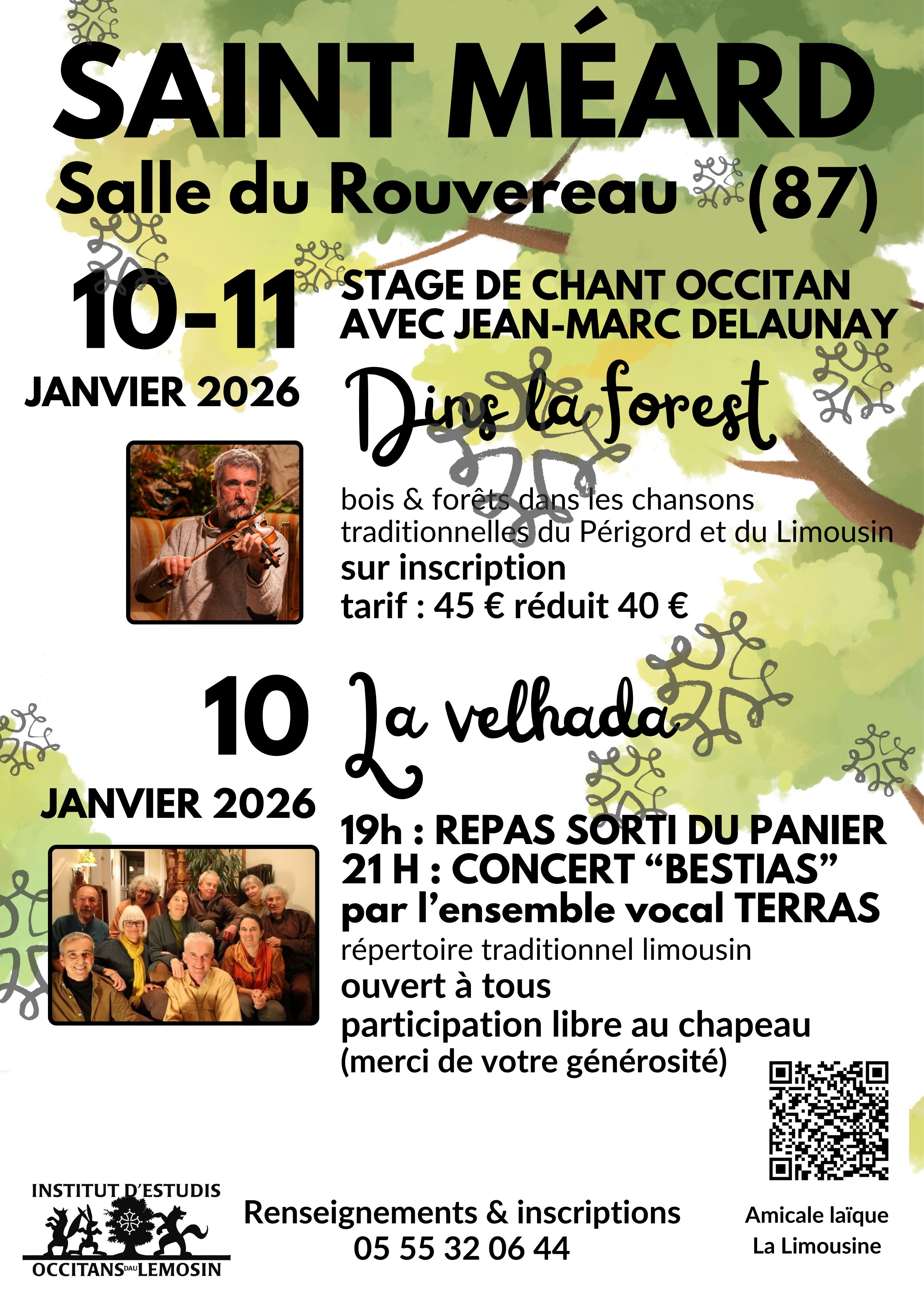 L’Institut d’Estudis Occitans dau Lemosin et l’Amicale laïque de Saint-Méard (87) ont le plaisir d’accueillir Jean-Marc Delaunay à la Salle du Rouvereau pour un stage de chant occitan qui vous plongera dans le riche répertoire traditionnel chanté du Limousin. Pendant deux jours, venez apprendre des chansons traditionnelles sur le thème des bois et forêts.