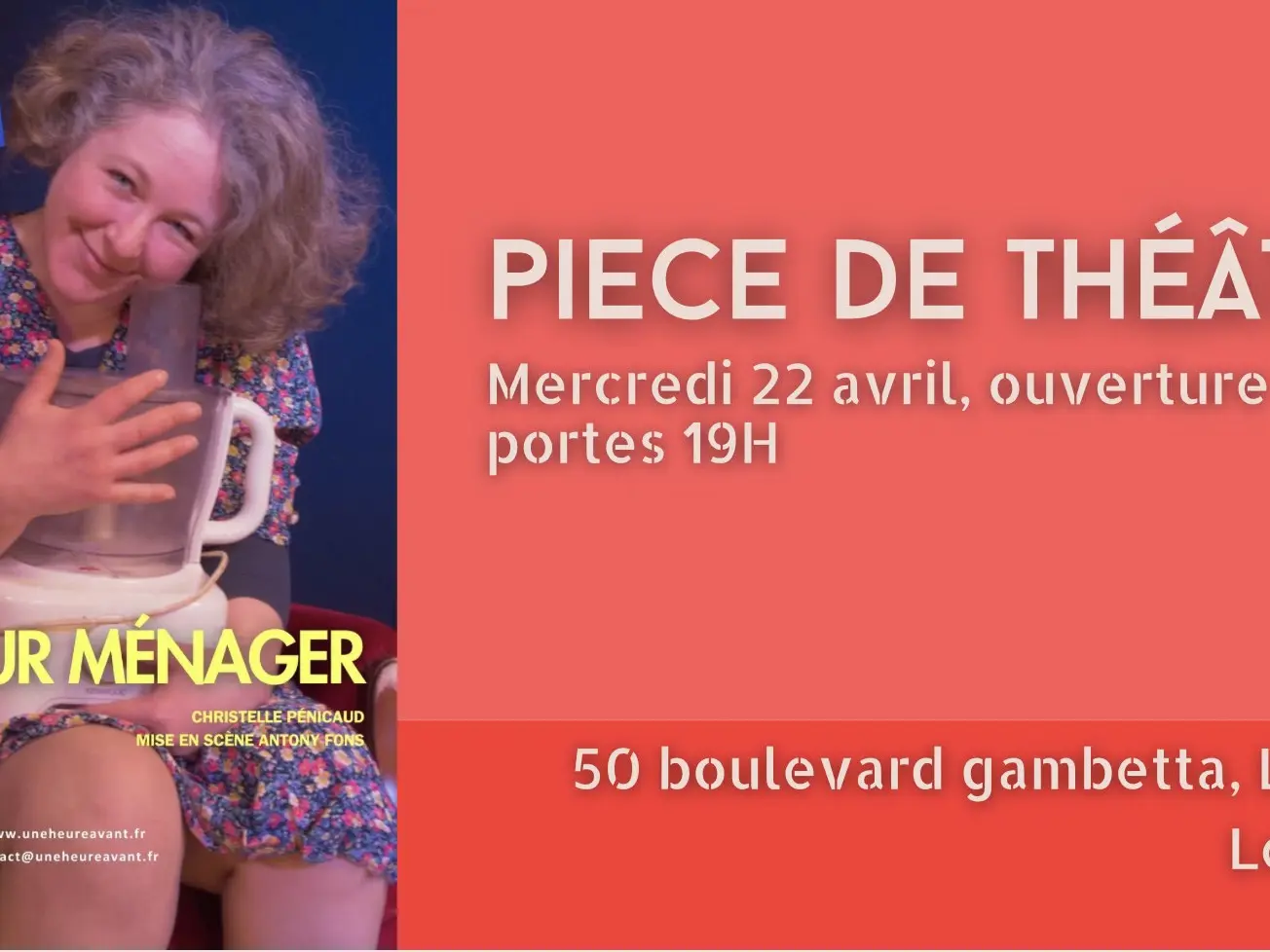 Venez vivre un moment de théâtre avec la pièce "Bonheur Ménager", organisée par l'association Une Heure Avant. Une soirée ouverte à tous, avec entrée prix libre, pour partager ensemble un instant de culture et d'émotion.