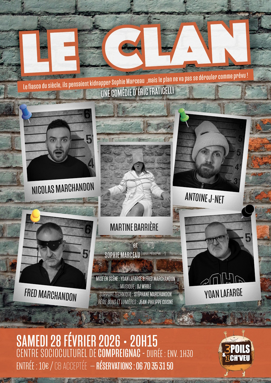 Une comédie théatrale d'Eric Fraticelli. Après avoir raté lamentablement leur dernier coup, Belette, Fred, Achille et Max, quatre truands, veulent frapper un grand coup. En effet, c'est ni plus ni moins Sophie Marceau que le quatuor souhaite enlever et prendre en otage. Ils élaborent un plan minutieux. Ce sera l'opération de la dernière chance mais celle-ci ne vas pas se dérouler comme prévu et ce coup restera certainement le fiasco du siècle. Le Clan est une comédie hilarante, cette équipe de truands ou plutôt de bras cassés nous font rire du début jusqu'à la fin. Une pièce très rythmée et le tout jouer avec un accent de notre île préférée la Corse.
