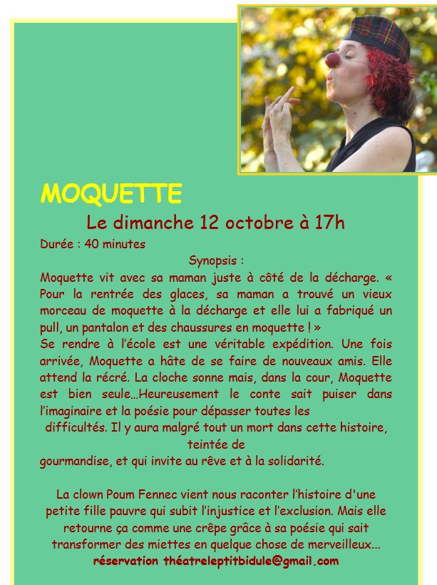La clown Poum Fennec nous emmène dans un univers haut en couleur, où un simple bout de moquette devient le point de départ d’une belle leçon d’humanité.