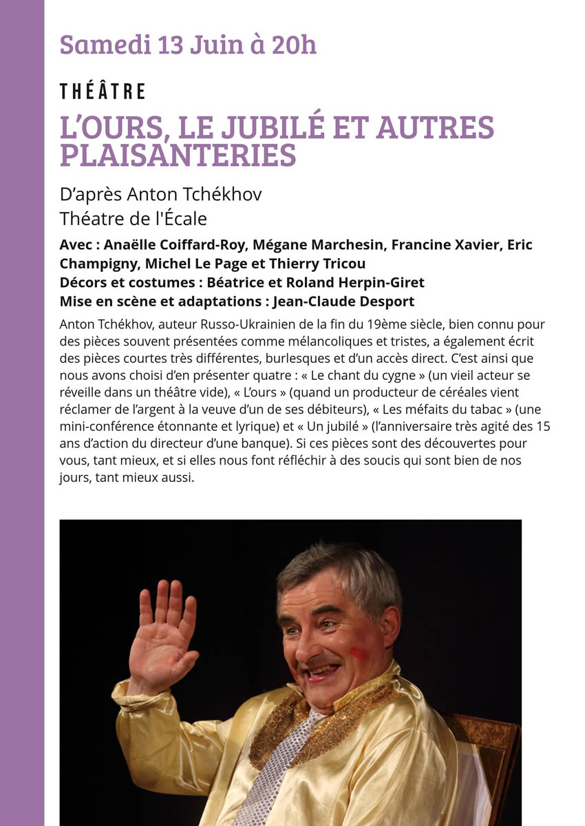 Anton Tchékhov, auteur Russo-Ukrainien de la fin du 19ème siècle, bien connu pour des pièces souvent présentées comme mélancoliques et tristes, a également écrit des pièces courtes très différentes, burlesques et d’un accès direct. C’est ainsi que nous avons choisi d’en présenter quatre : « Le chant du cygne » (un vieil acteur se réveille dans un théâtre vide) « L’ours » (quand un producteur de céréales vient réclamer de l’argent à la veuve d’un de ses débiteurs) « Les méfaits du tabac » (une mini-conférence étonnante et lyrique) « Un jubilé » (l’anniversaire très agité des 15 ans d’action du directeur d’une banque).