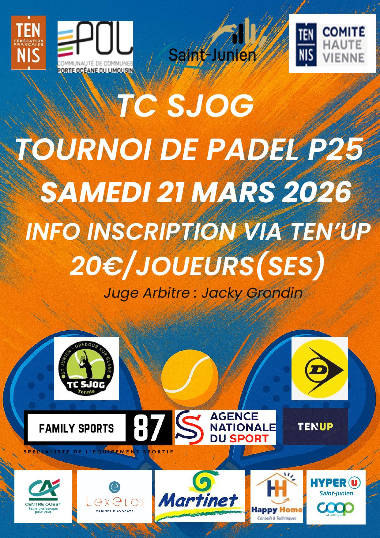 Plongez dans une ambiance électrique et conviviale au cœur de Saint-Junien pour une journée 100 % padel ! Le TC SJOG vous invite à participer à son Tournoi de Padel P25, un événement sportif incontournable arbitré par le talentueux Jacky Grondin.