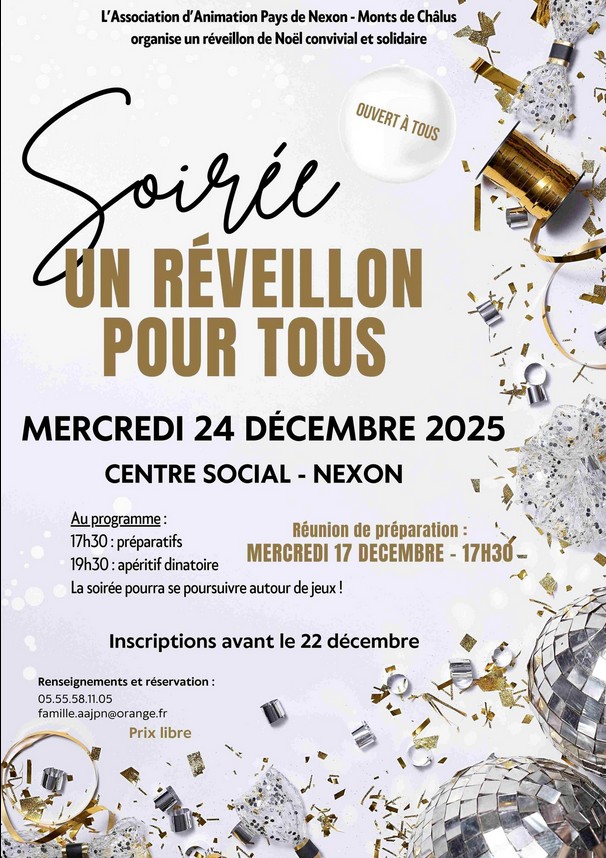 L’Association d’Animation du Pays de Nexon – Monts de Châlus organise une soirée de réveillon conviviale et ouverte à tous le mercredi 24 décembre 2025 au Centre Social de Nexon. Pensée comme un moment chaleureux et solidaire, cette soirée s’adresse aux familles, aux habitants du territoire et à toutes celles et ceux qui souhaitent partager un temps festif à l’approche de Noël.
