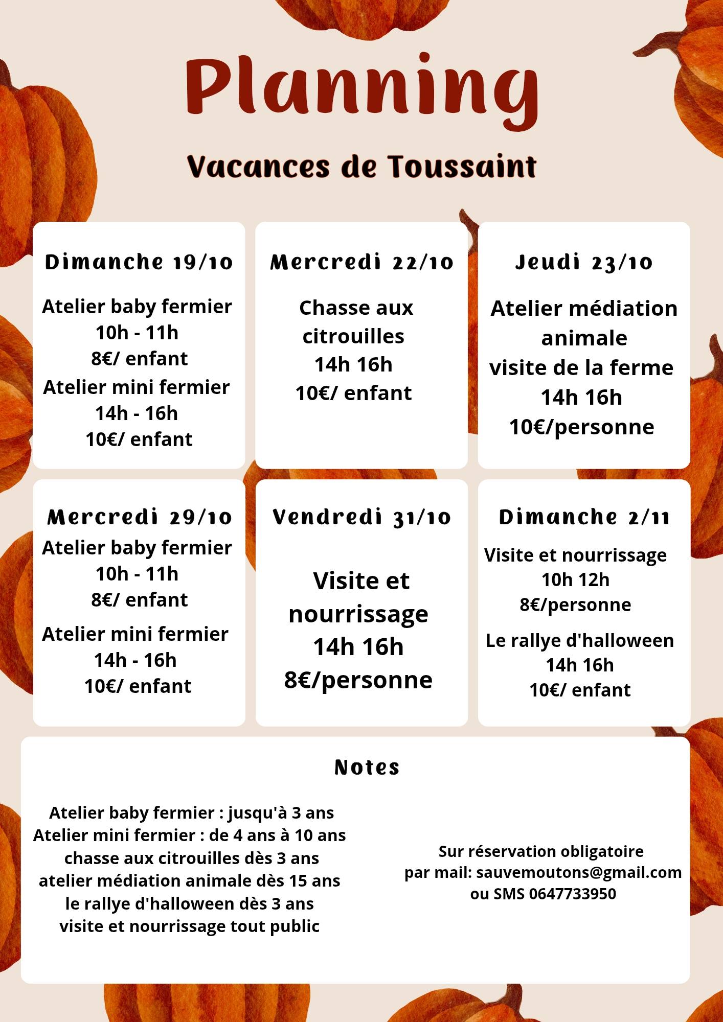 L'association et la ferme vous propose plusieurs ateliers. Baby fermier pour les moins de 3 ans qui découvrent les animaux tout en douceur. Mini fermier à partir de 3 ans à la découverte des animaux, de la ferme, le nourrissage, le soin et les câlins. Une chasse aux citrouilles pour repartir avec des gourmandises tout en évoluant dans la ferme : ouvert à tous, venir déguisé. Atelier médiation animale réservé aux personnes qui ont besoin d'un temps d'apaisement et de calme auprès des animaux, un moment de douceur et de convivialité. Visite de la ferme guidée et nourrissage pour découvrir la ferme et ses animaux . Rallye d'Halloween : jeu avec récompense qui se déroule au milieu de la ferme, venez déguisé !