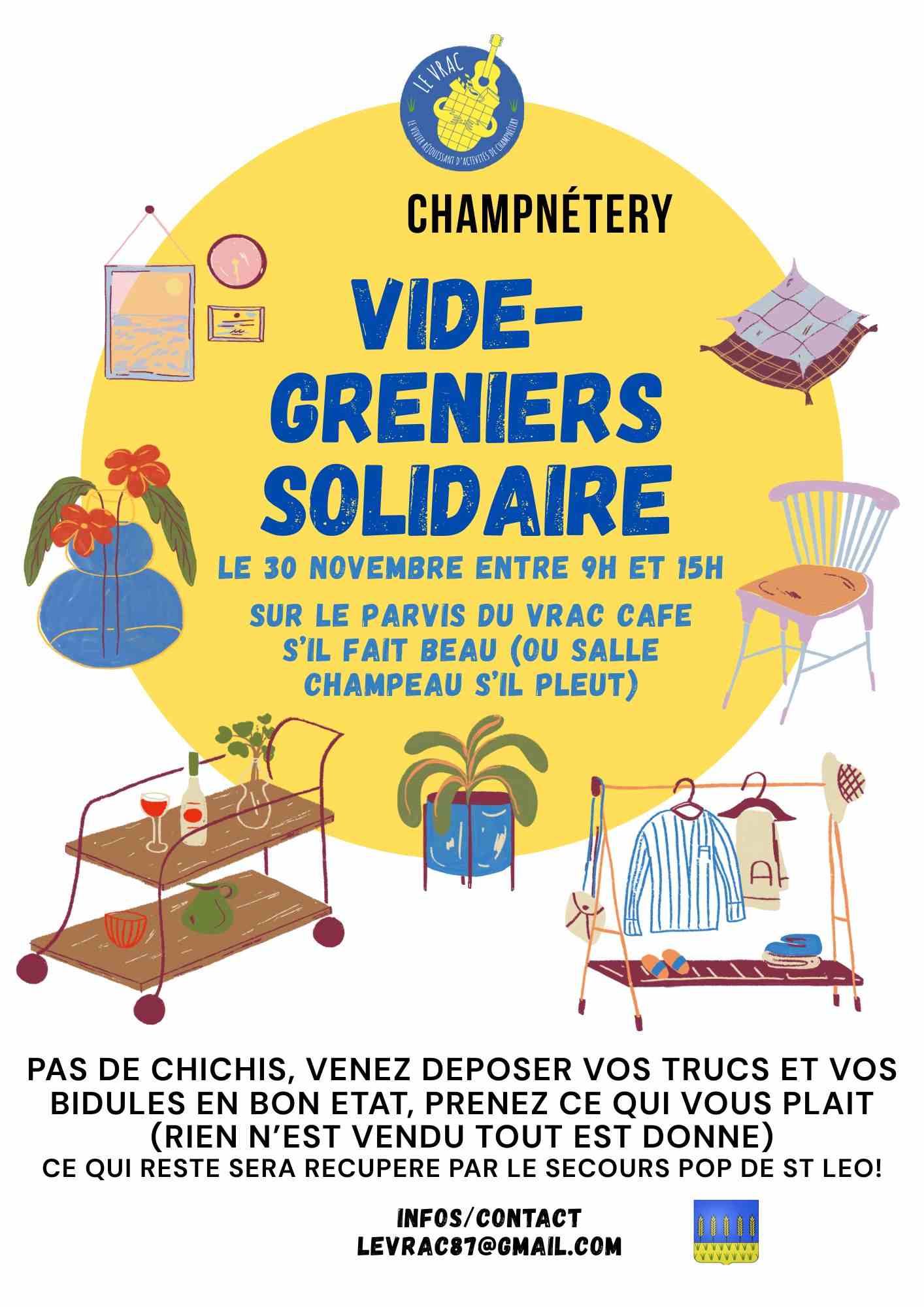 Vide greniers solidaire sur le parvis du Vrac café. Pas de chichis, venez déposer vos trucs et vos bidules en bon état, prenez ce qui vous plait (rien n'est vendu, tout est donné). Ce qui reste sera récupéré par le Secours Populaire de Saint-Léonard de Noblat
