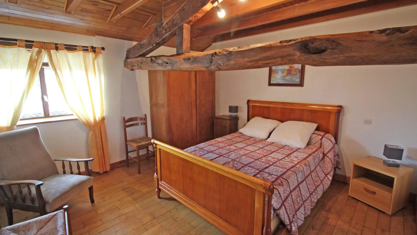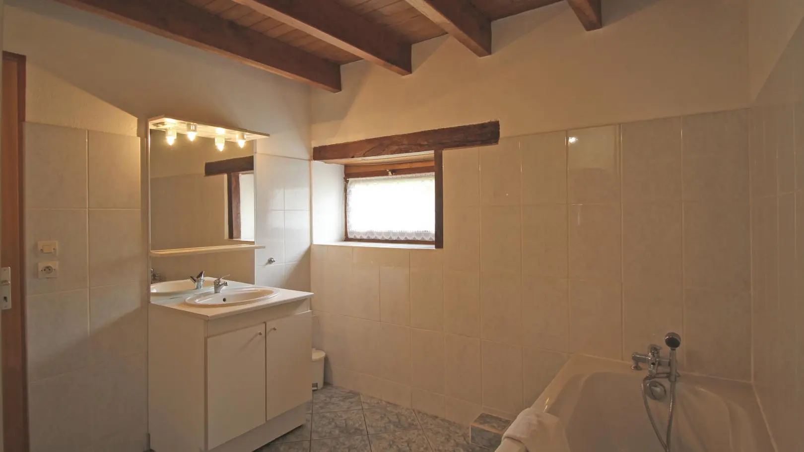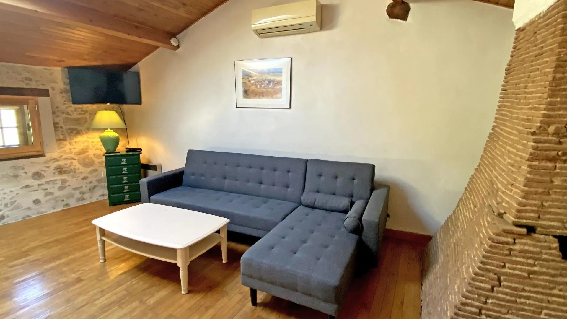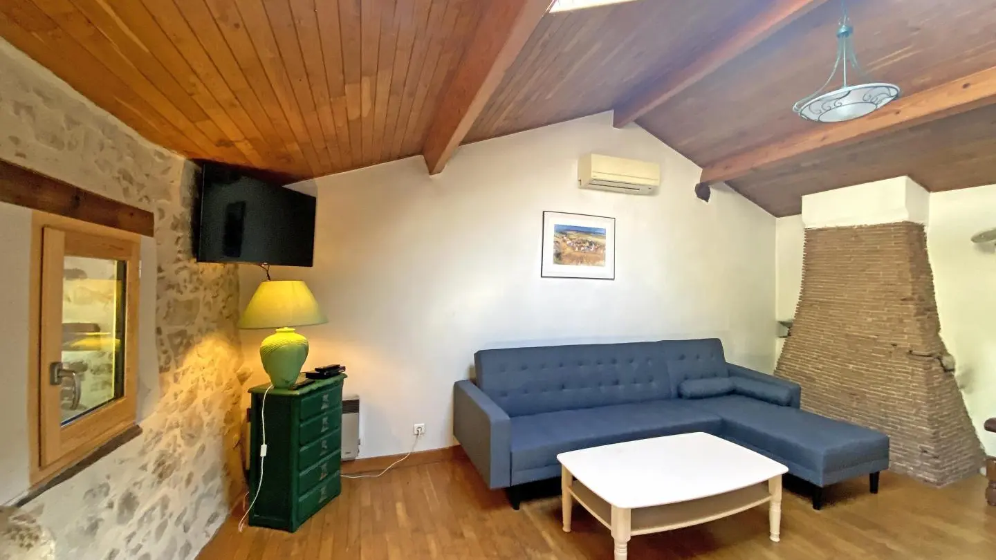 Dans un hameau résidentiel de la proximité de Limoges, la maison mitoyenne ouvre sur l'arrière sur une terrasse et un jardin de 150 m² clos. Ses petites ouvertures, sa poutraison et ses pierres apparentes confèrent au séjour et à la chambre du rez-de-chaussée un caractère rustique.