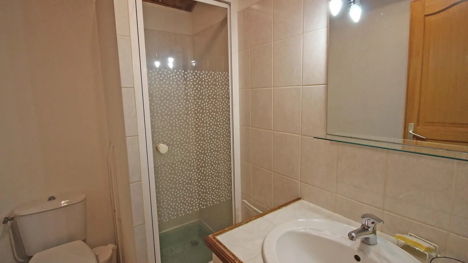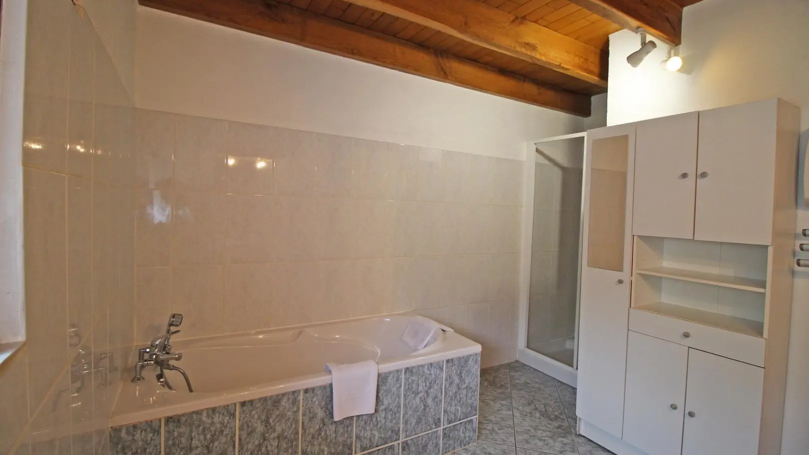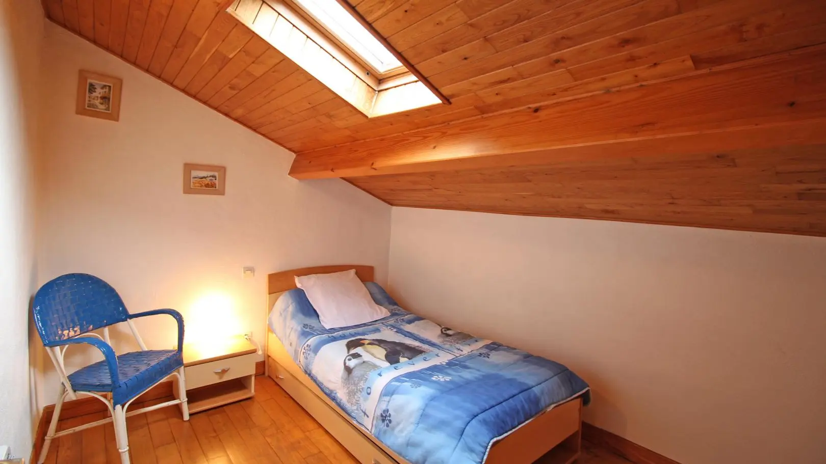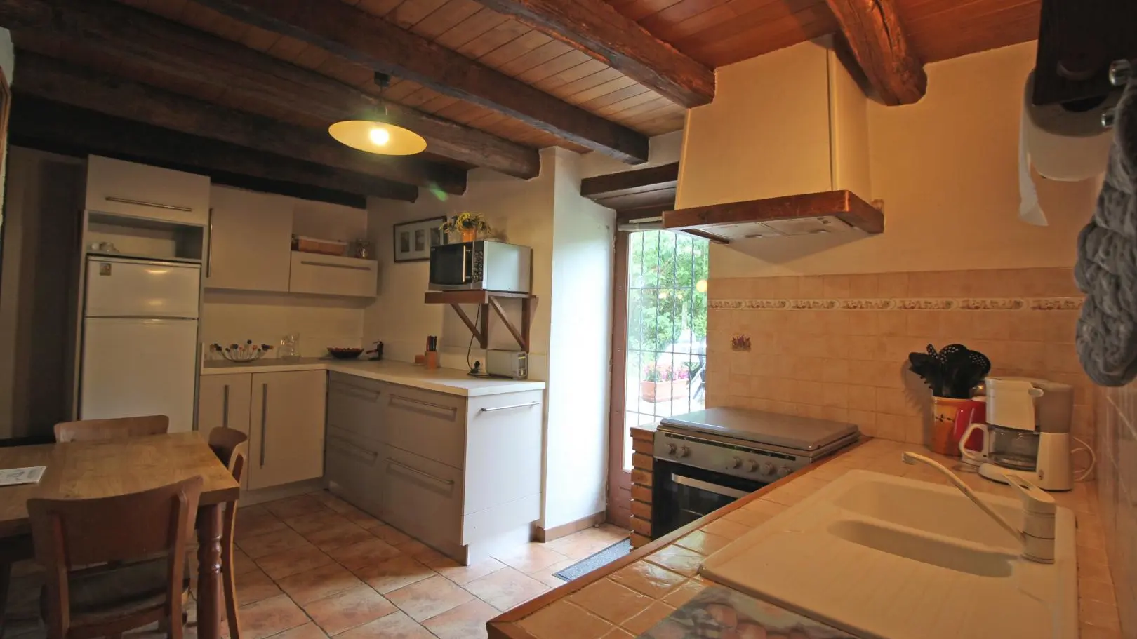 Dans un hameau résidentiel de la proximité de Limoges, la maison mitoyenne ouvre sur l'arrière sur une terrasse et un jardin de 150 m² clos. Ses petites ouvertures, sa poutraison et ses pierres apparentes confèrent au séjour et à la chambre du rez-de-chaussée un caractère rustique.